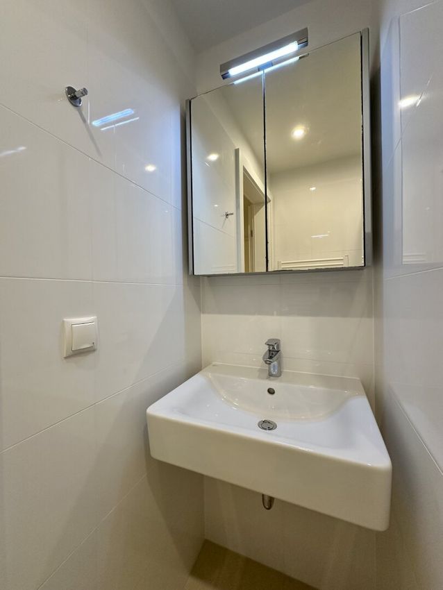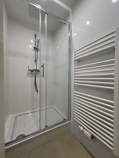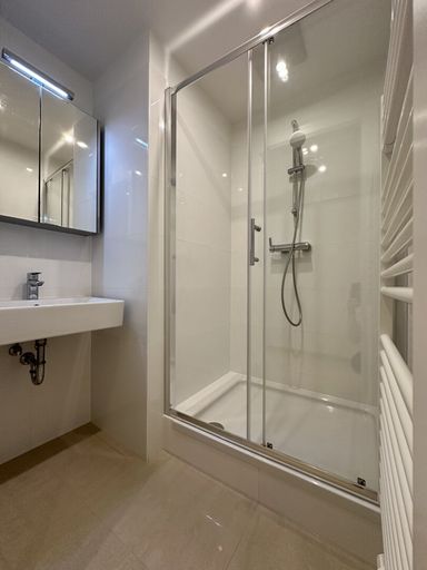 Badezimmer mit Dusche, Waschtisch & Handtuchheizkörper