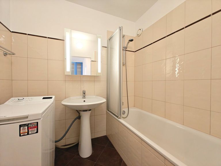 + Badezimmer mit Waschbecken, Badewanne und Waschmaschine