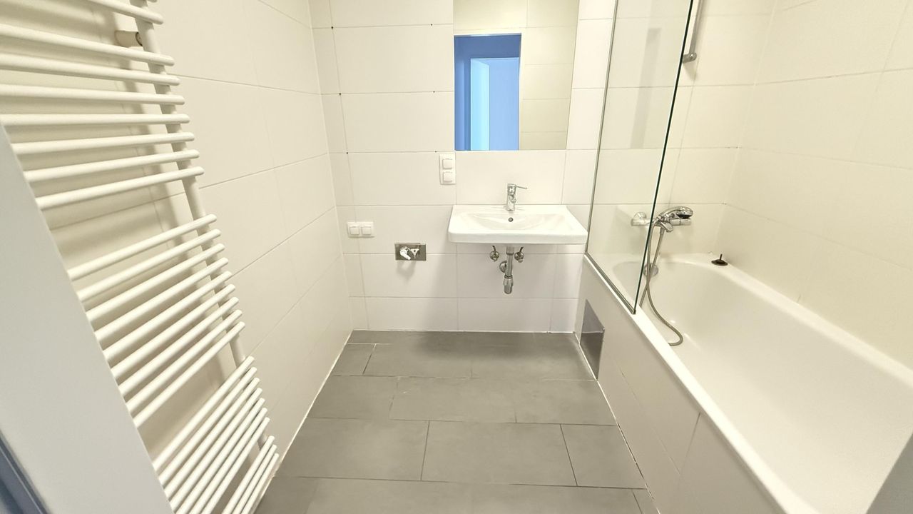 • Bad mit Badewanne mit Duschmöglichkeit, Waschtisch, Waschmaschinenanschluss und Handtuchheizkörper