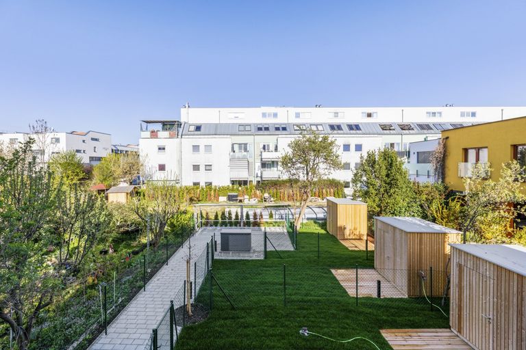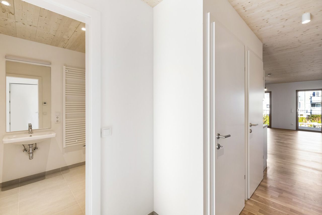 eigener Garten im Erdgeschoss, Fußbodenheizung, Luftwärmepumpe, innovativer Holz-Hybridbau, Holzdecken, Holzmassivfenster, hochdämmende Dreischeibenisolierverglasung