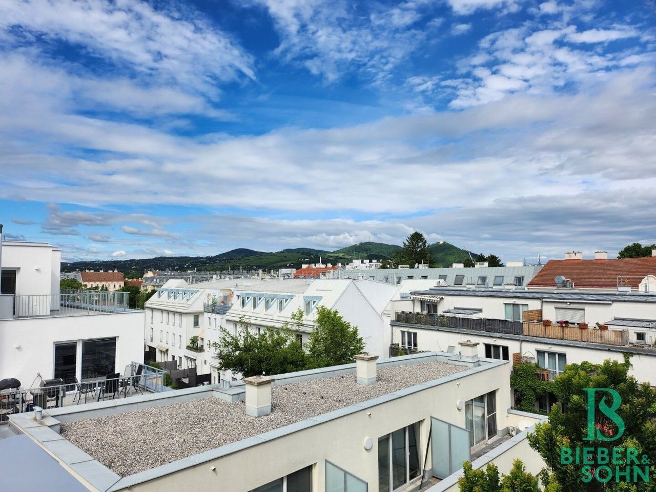 Über einen großzügigen Eingangsbereich mit Platz für eine kleine Garderobe und einem anschließenden eleganten Bad mit Dusche, WC und Waschmaschinenanschluss, gelangt man in den wunderschönen und hellen, ca. 24 m² großen Wohnbereich von dem aus die sonnige, ca. 6 m² große Süd-West Terrasse, mit traumhaftem Ausblick auf den Kahlenberg, die offen gehaltene Dieter Knoll Küche samt Geräten und ein weiteres großes Zimmer zu erreichen sind.
