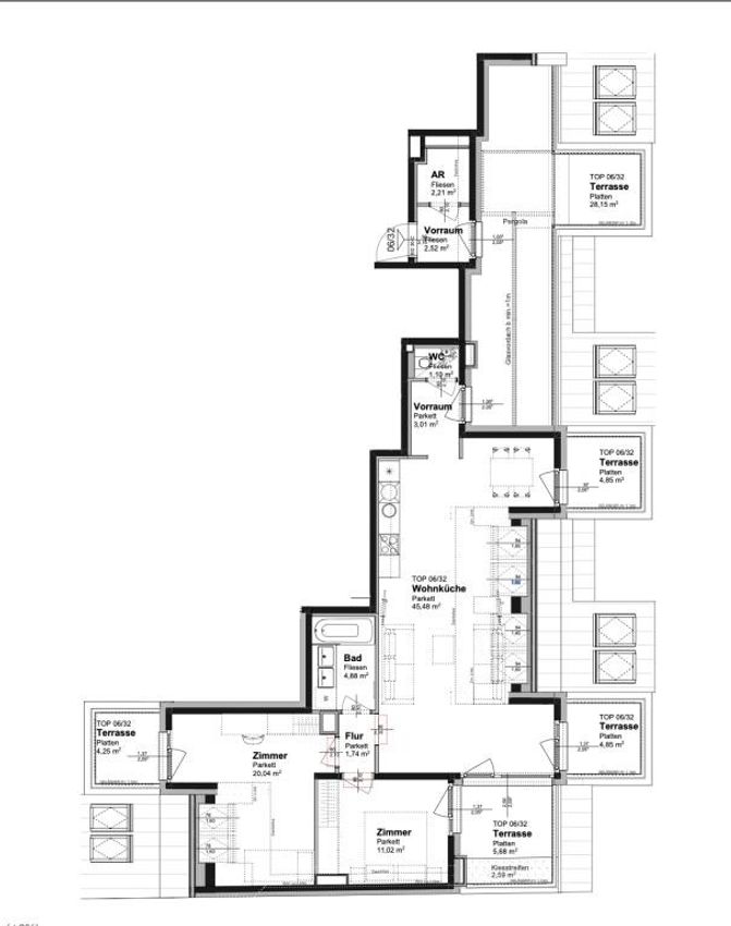 DACHGESCHOSS: 3-Zimmer Neubauwohnung (92,00m²) MIT 47,78m² TERRASSENFLÄCHE: (28,15m² Terrasse) + (4,85m² Terrasse) + (4,85m² Terrasse) + (5,68m² Terrasse +,2,59m² Kiesstreifen) + (4,25m² Terrasse)! Top-Ausstattung! Optimale Infrastruktur!! RAUMAUFTEILUNG IN STICHWORTEN • Vorraum • Wohnzimmer mit offener Küche • 2 Schlafzimmer • Bad mit Badewanne inkl. Duschmöglichkeit, Waschtisch, Waschmaschinenanschluss und Handtuchheizkörper • WC mit Waschbecken • 5 Terrassen • Kellerabteil HIGHLIGHTS AUF EINEN BLICK • Fußbodenheizung (Gaszentralheizung, keine Therme!) • jeder Raum verfügt über ein Raumthermostat • Außenrollläden • Sicherheitswohnungseingangstüren • hochwertiger Parkettboden (Eiche) • EWE-Küche mit hochwertigen Elektrogeräten (E-Herd, Cerankochfeld, Geschirrspüler, Kühl-Gefrier-Kombination, Dunstabzug und Spüle) • hochwertige Ausstattung auch im Badezimmer...
