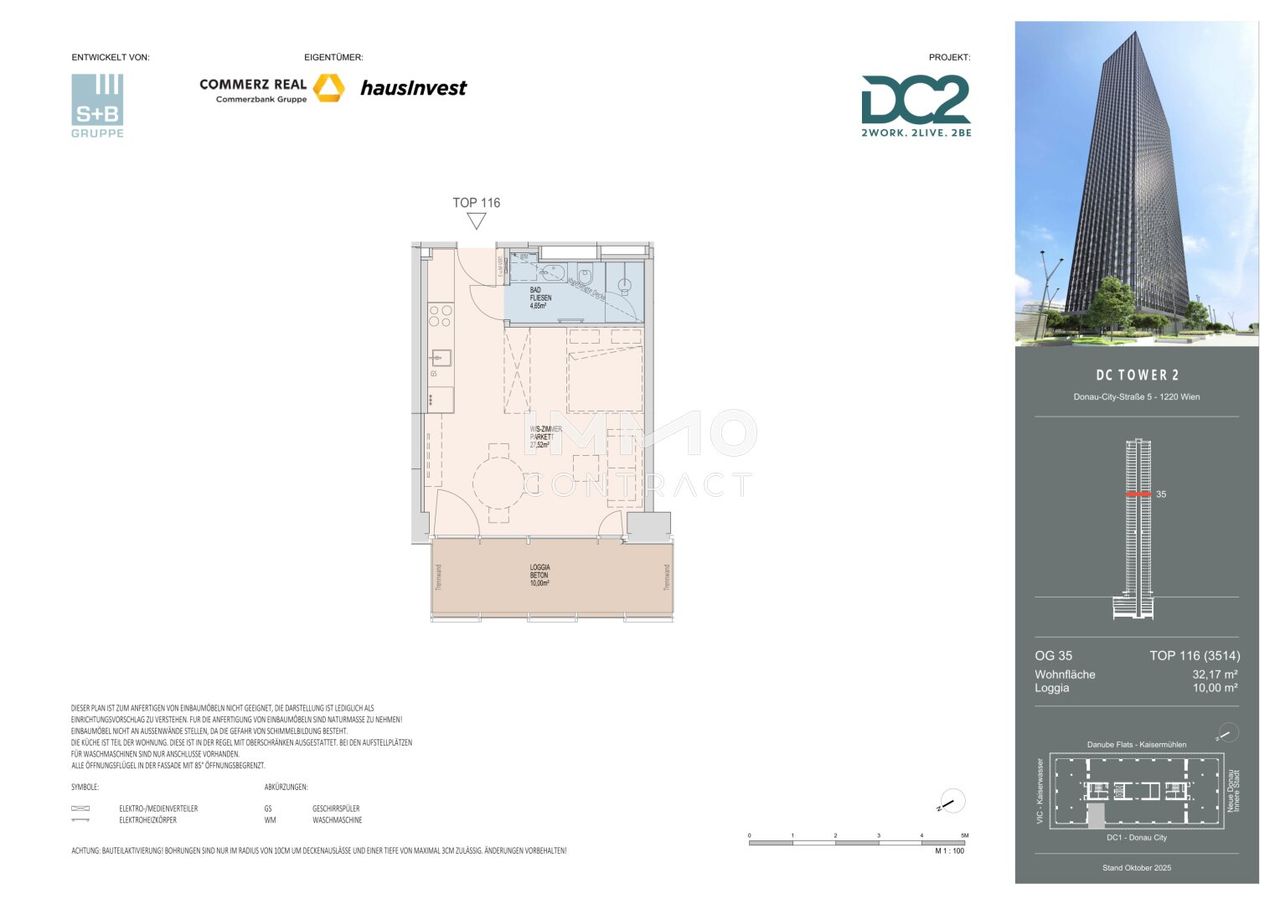 Dieses 1-Zimmer-Apartment im DC2 Tower ist ein Rückzugsort über der pulsierenden Metropole – mit einem Blick über Wien. Die westliche Ausrichtung schenkt der Wohnung ein warmes Nachmittags- und Abendlicht und macht jeden Sonnenuntergang zu einem privaten Schauspiel über den Dächern der Stadt.