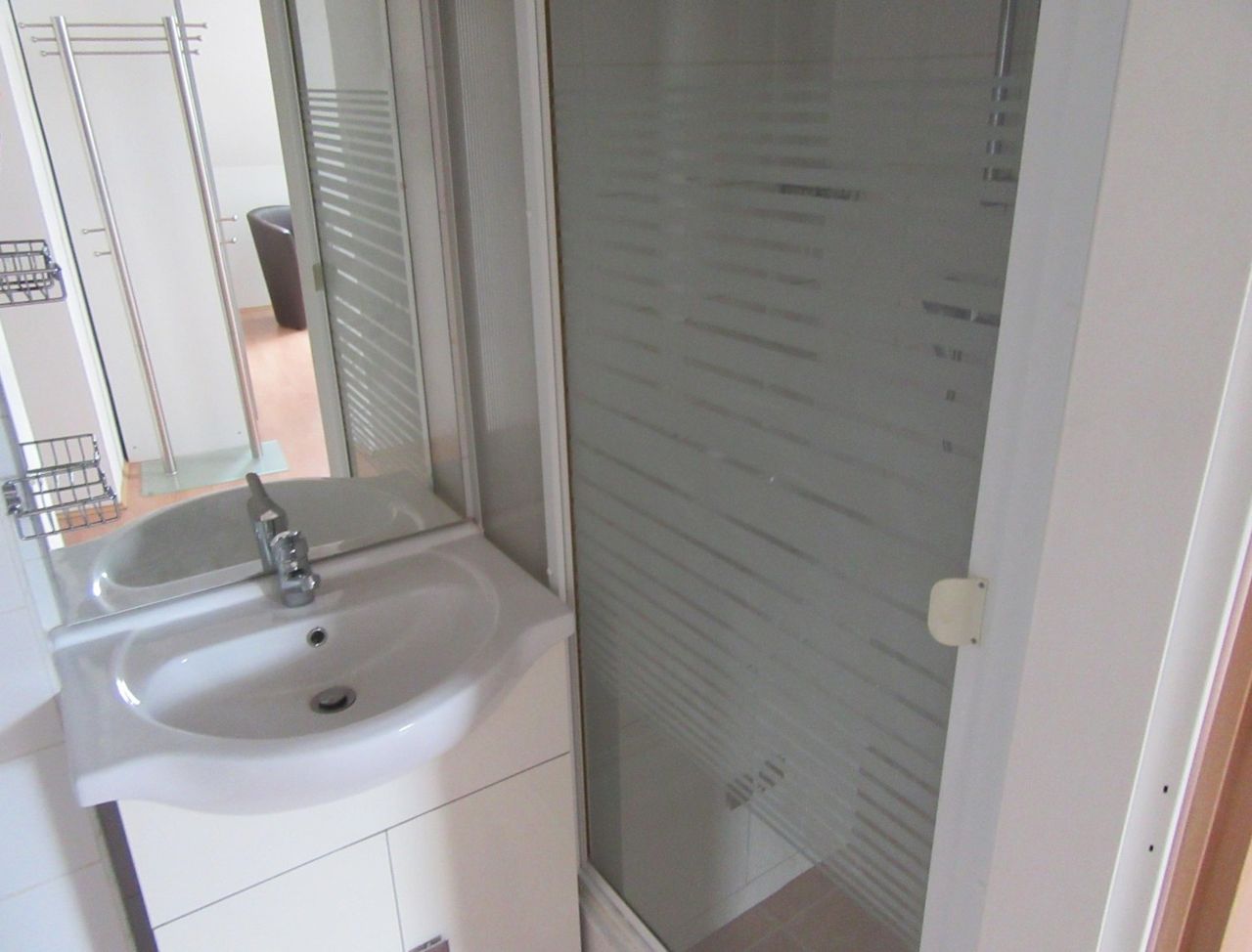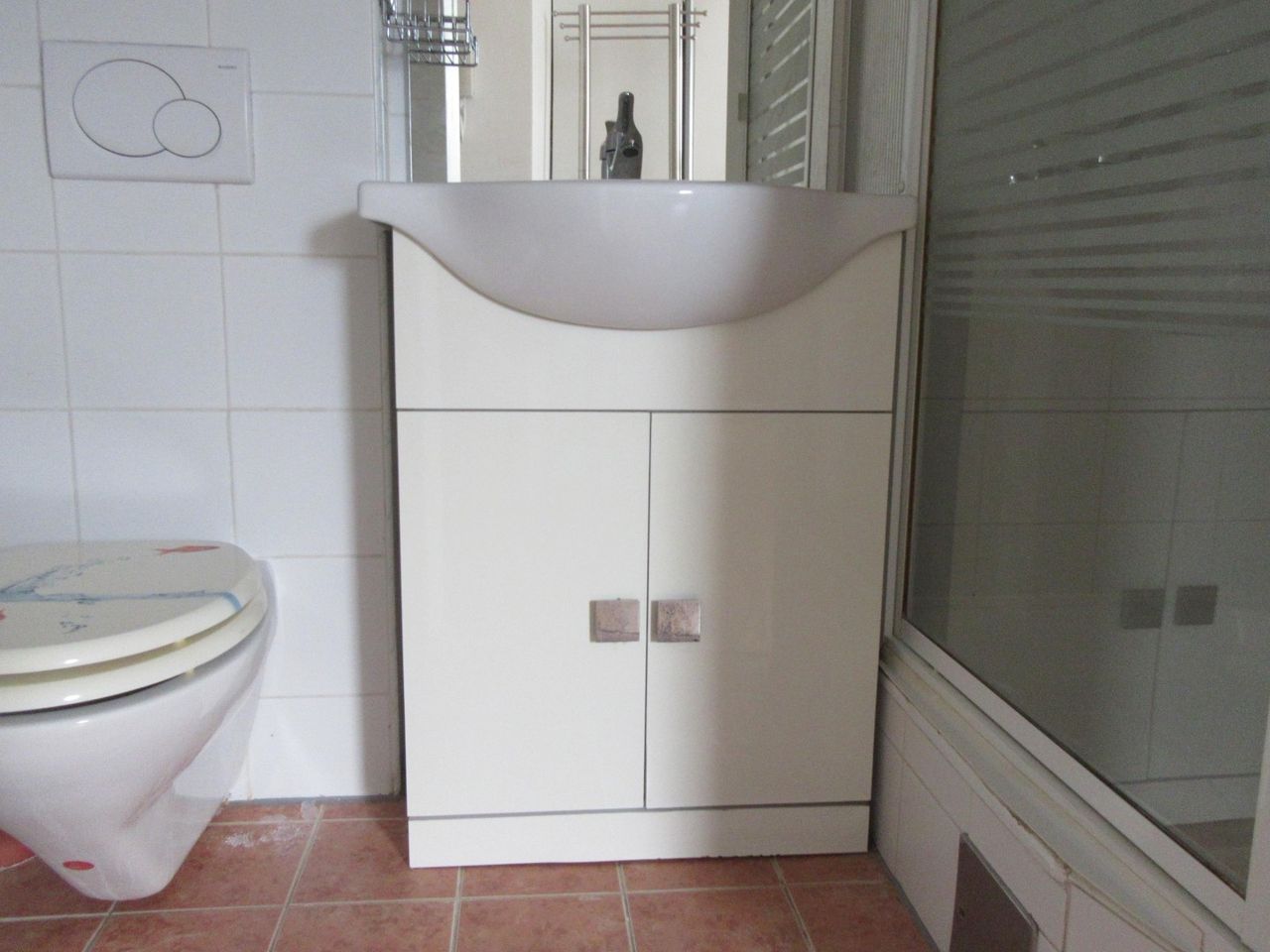 Badezimmer mit Dusche, Waschtisch und WC.