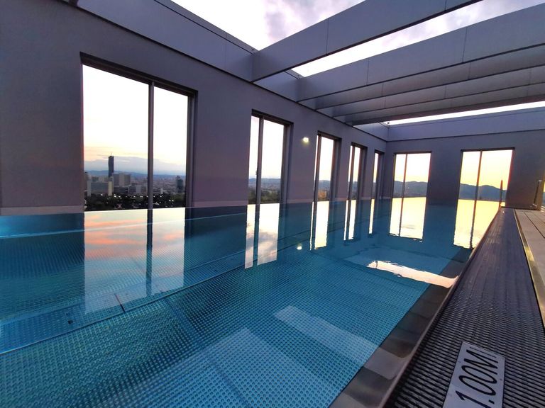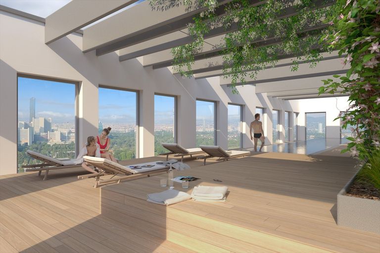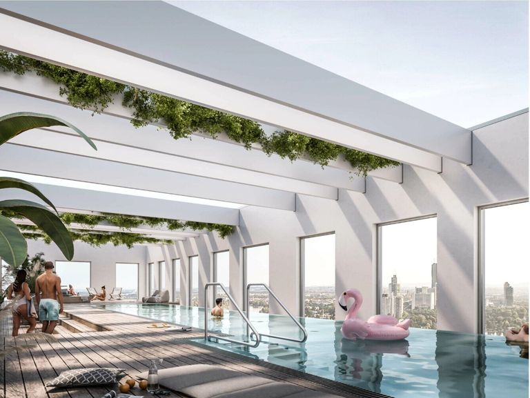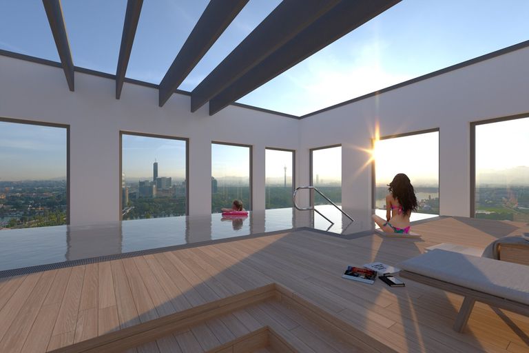 - Rooftop-Pool mit 19m Länge und Sonnendeck (33. Stock)