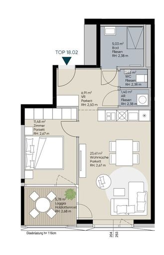 Diese 2-Zimmer-Wohnung erstreckt sich auf ca. 55 m² (inkl. Loggia) und gliedert sich wie folgt: