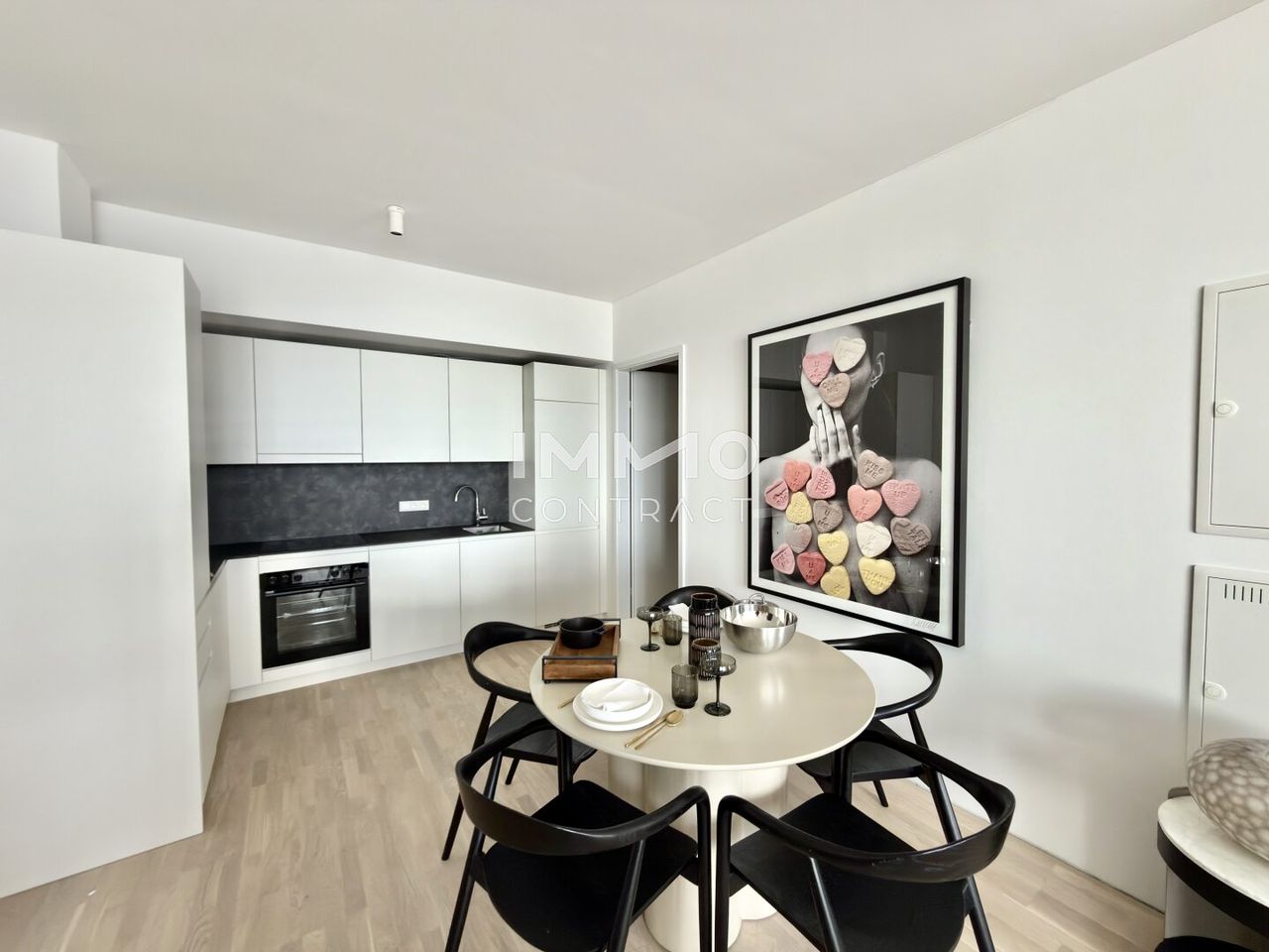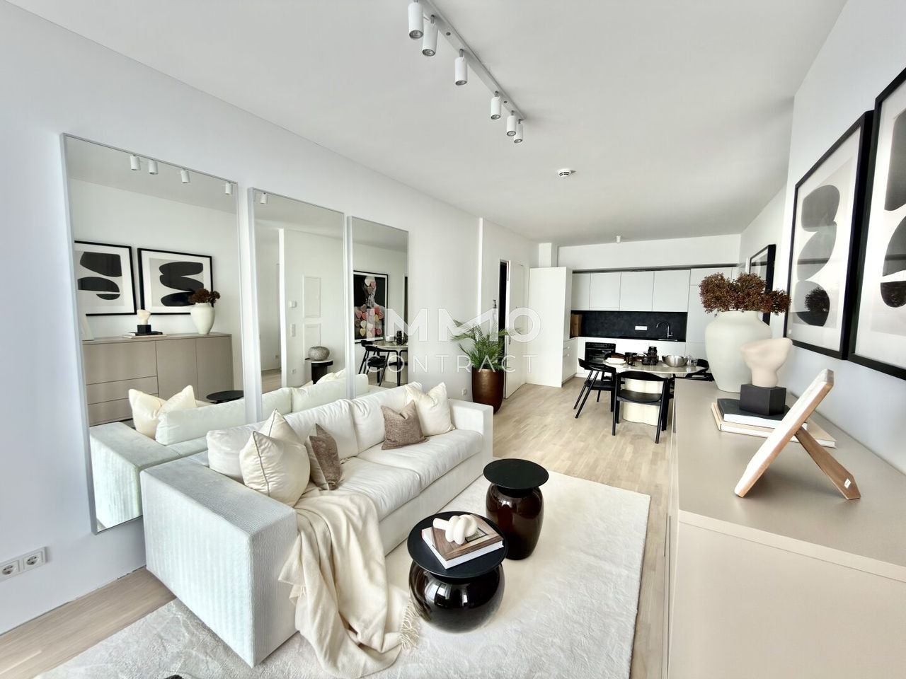 Beim Eintreten befindet sich linkerhand die praktisch integrierte Küchenzeile mit Essbereich, die sich harmonisch in den Wohnraum einfügt. Gegenüber öffnet sich der helle Wohnbereich, in dem Wohnen und Entspannen im Mittelpunkt stehen. Durch einen stilvollen Raumteiler ist der Schlafbereich optisch vom Wohnraum getrennt und schafft so eine angenehme Balance zwischen Offenheit und Privatsphäre. Das Badezimmer ist mit Dusche, Handwaschbecken, integriertem WC sowie Waschmaschinenanschluss ausgestattet.