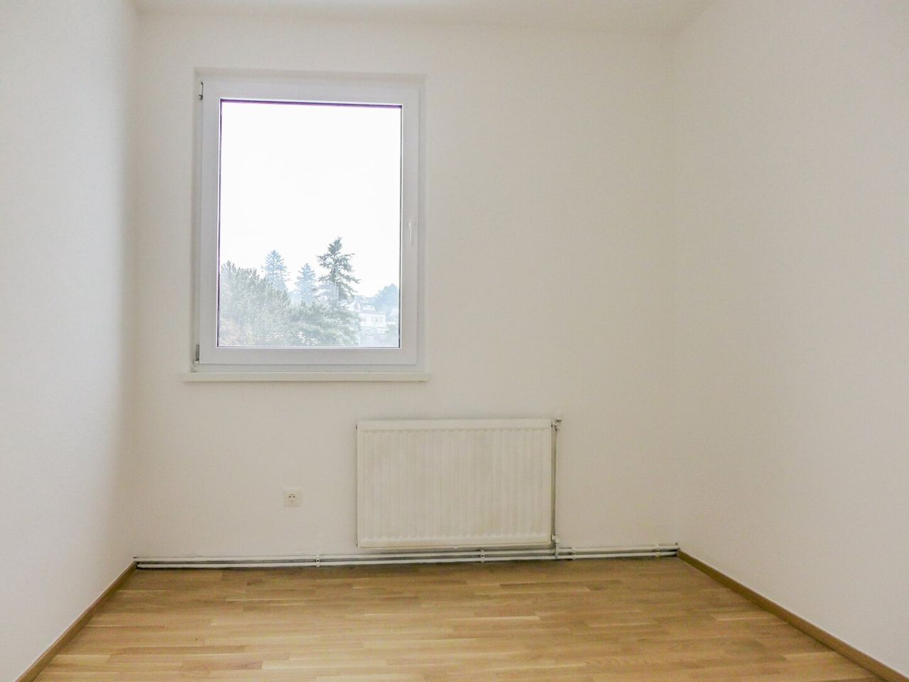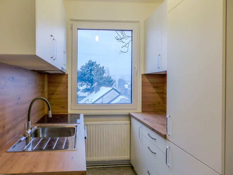 Vom Vorraum gelangt man in Küche und Bad sowie den großen, zentralen Wohnraum. Die beiden weiteren Räume sind von diesem getrennt begehbar. Den geräumigen Balkon betritt man ebenfalls direkt vom Wohnraum. Hier genießt man einen herrlichen Fernblick über die Stadt ins Grüne.