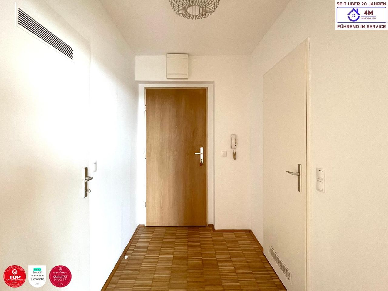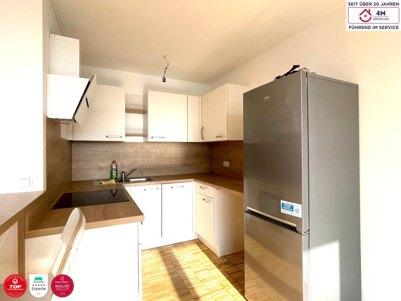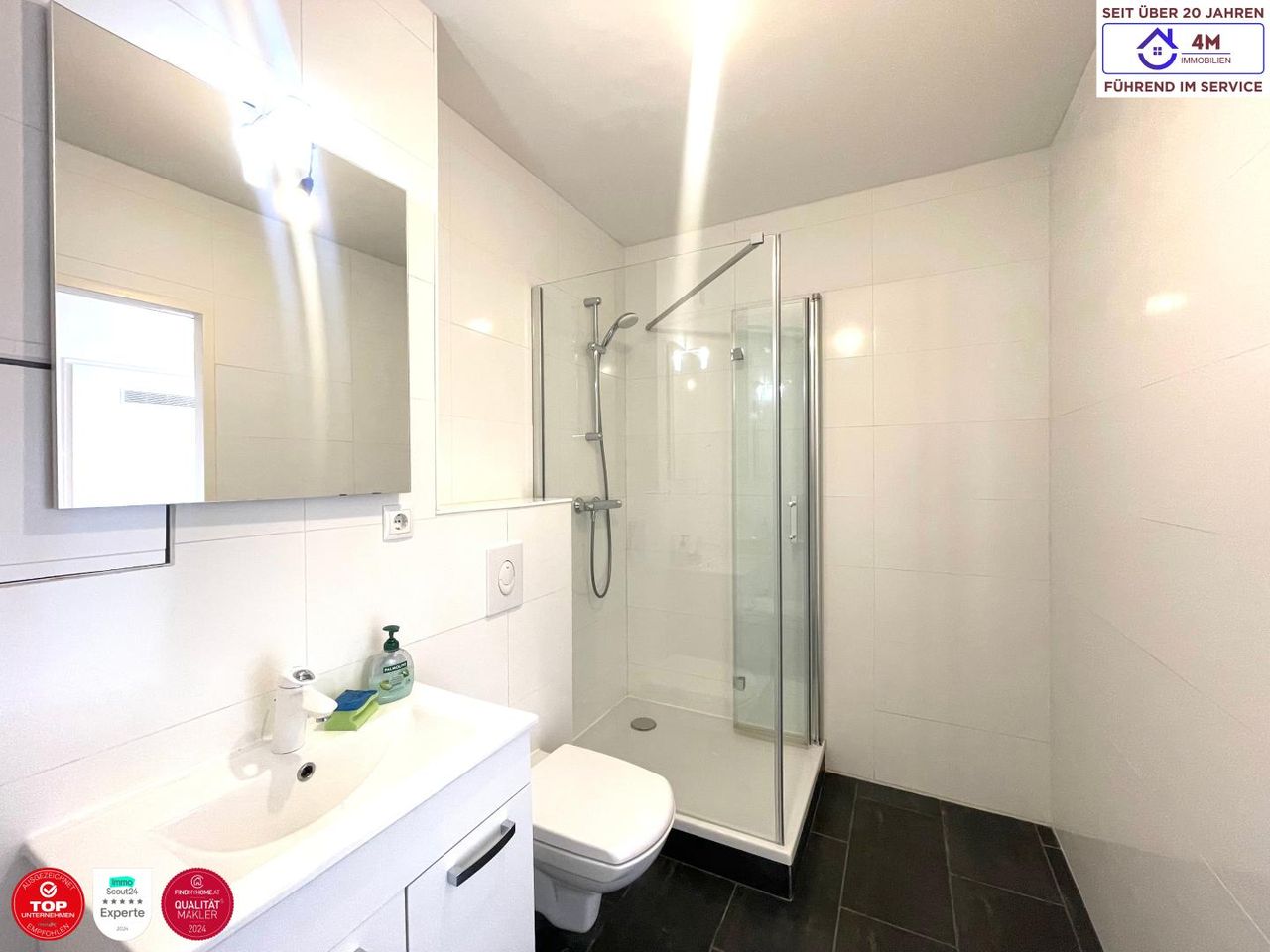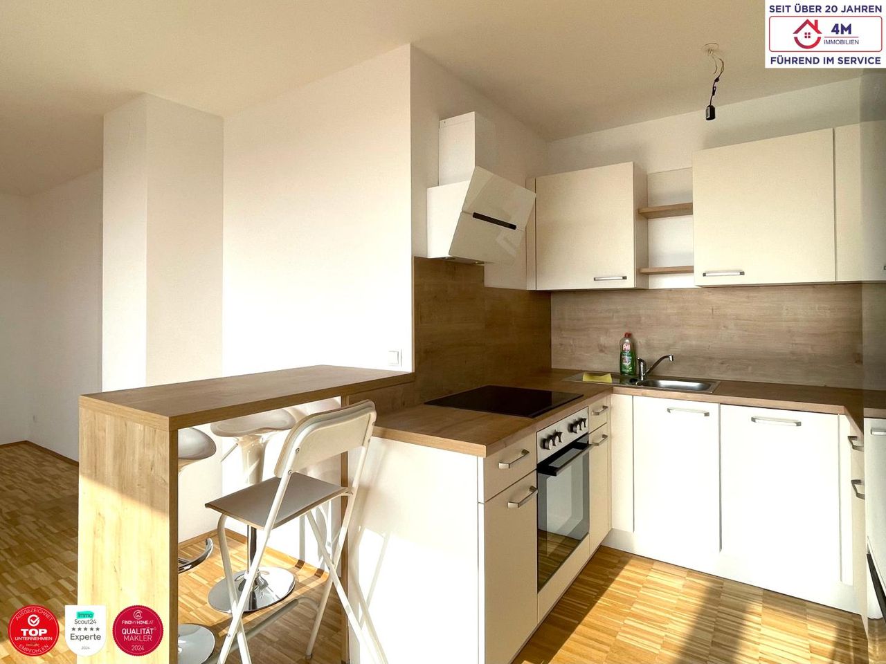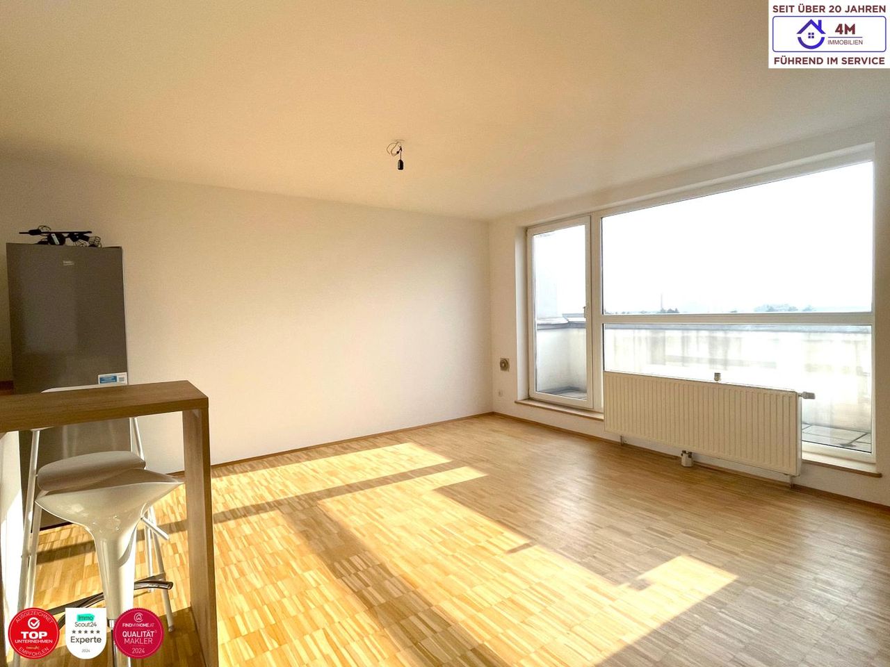 Zur Vermietung gelangt ab sofort eine provisionsfreie, sehr helle 1-Zimmer-Wohnung im 5. Stock eines gepflegten Wohnhauses in 1230 Wien, Perfektastraße. Die Wohnung überzeugt durch ihre sonnige Terrasse mit Fernsicht sowie eine moderne und ansprechende Ausstattung. Ein Kfz-Stellplatz im Haus ist bereits im Mietpreis inkludiert und rundet das Angebot ideal ab. Geschäfte des täglichen Bedarfs befinden sich in fußläufiger Entfernung. Die Buslinie 64A hält direkt vor der Haustüre und sorgt für eine sehr gute öffentliche Anbindung. Raumaufteilung ca. 49 m²: - Vorraum - Wohnraum - Kochnische mit Essplatz - Bad mit Dusche und WC - Abstellraum - Terrasse mit ca. 9m2...
