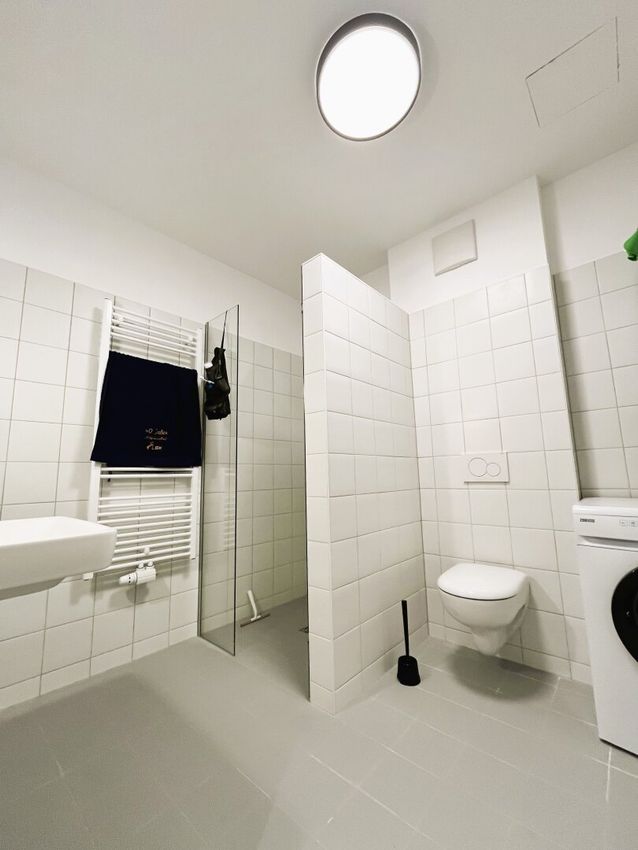 --> modernes Badezimmer mit Walk-In-Dusche, WC und Waschmaschine + zweites Extra-WC
