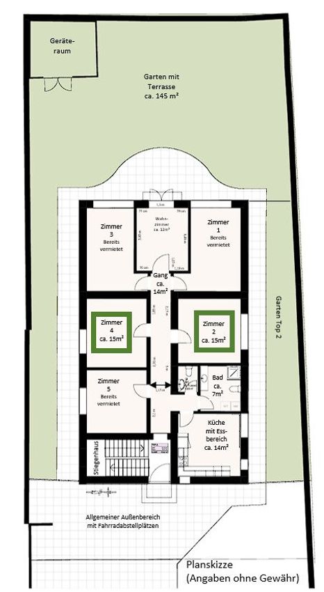 - Zimmer 2 Fläche: ca. 15m² * ab 30.6.2026 (oder ev. auch früher verfügbar)