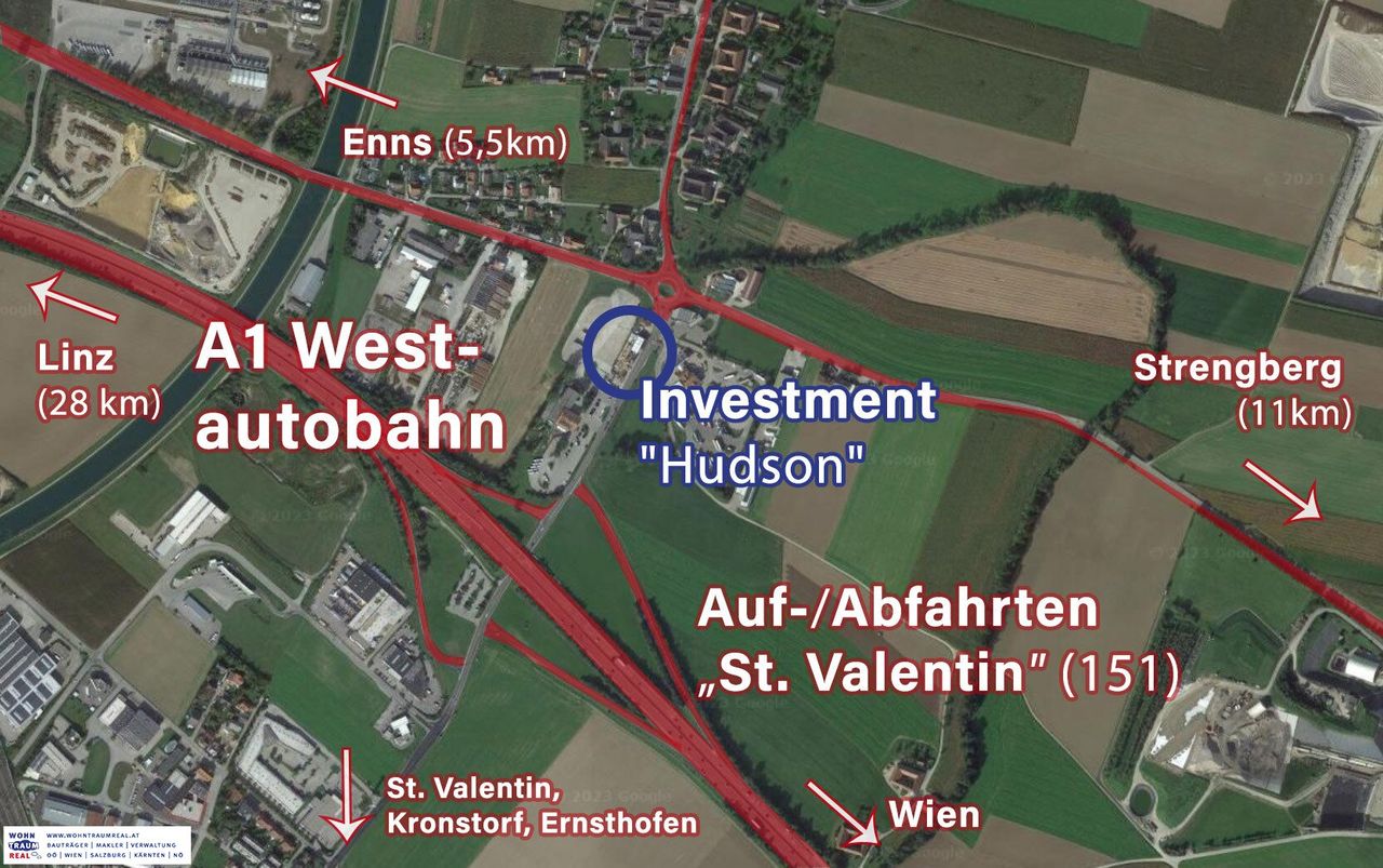 direkt gelegen an den a1 autobahnauf- und abfahrten 151 "st. valentin", sowie an der kreuzung (kreisverkehr) der bundesstraße b1 und landesstraße 123a. alle zum investmentobjekt gehörenden gewerbe profitieren von der perfekten anbindung und der regen verkehrslage. die restaurants werden zudem von den bewohnern der umliegenden städten und gemeinden frequentiert ( st. valentin, enns, strengberg, kronstorf, ernsthofen, linz u.v.m.). die gut laufenden geschäfte garantieren die monatlichen renditen aus den bestehenden mietverträgen.
