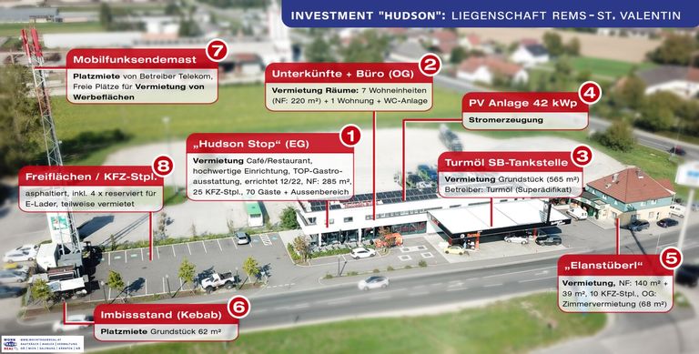 das „hudson stop“ in st. valentin ist ein hochattraktives multi-use-investment mit breit gestreuter einkommensbasis und ausgezeichneter lage direkt an der A1-abfahrt.