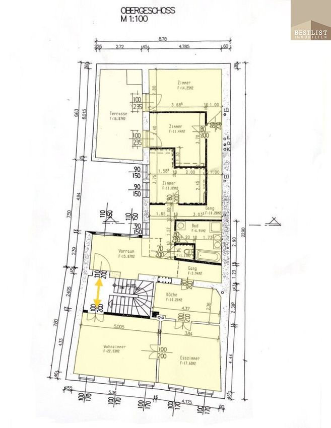 Diese großzügige Wohnung erstreckt sich über das gesamte Obergeschoss und bietet eine Wohnfläche von ca. 125 m². Die Fläche verteilt sich auf einen Vorraum, ein Wohnzimmer, ein Esszimmer, eine Küche, ein Bad, ein separates WC und drei weitere Zimmer. Zur Wohnung gehört auch eine großzügige Terrasse.