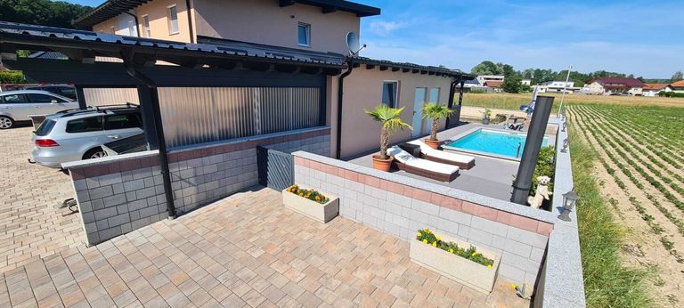 Die Immobilie bietet zudem ausreichend Stellplätze. Ein Carport, eine Garage sowie zusätzliche Parkplätze sind vorhanden, sodass sowohl Bewohner als auch Gäste stets bequem parken können. Eine Luftwärmepumpe sorgt für effiziente Wärme und trägt zu einem umweltfreundlichen Lebensstil bei.