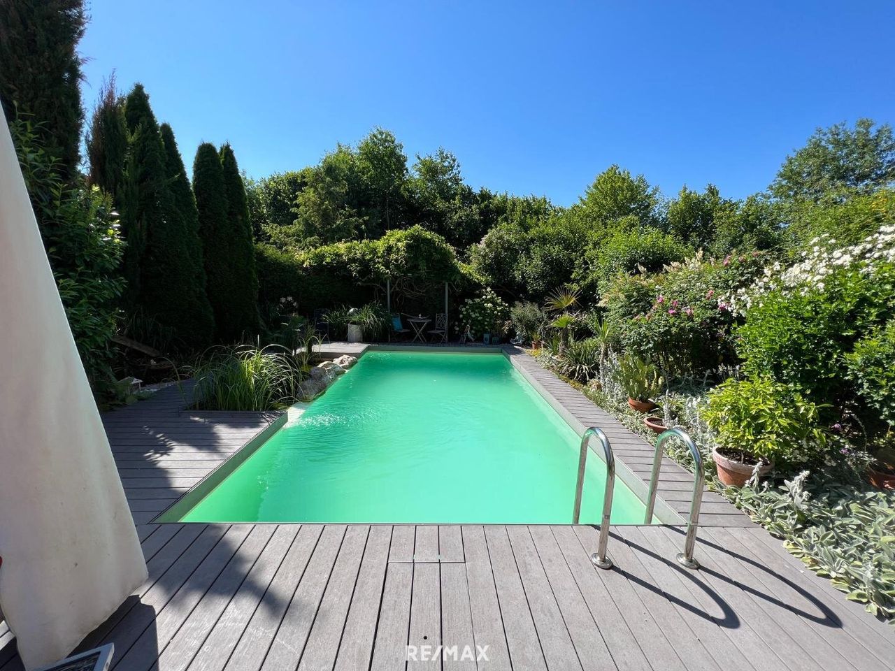 Diese Kombination aus Gartenidylle und modernem Poolbereich schafft einen privaten Rückzugsort, der zum Entspannen einlädt.