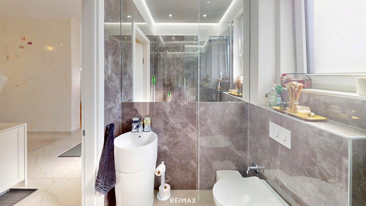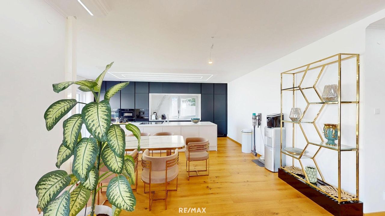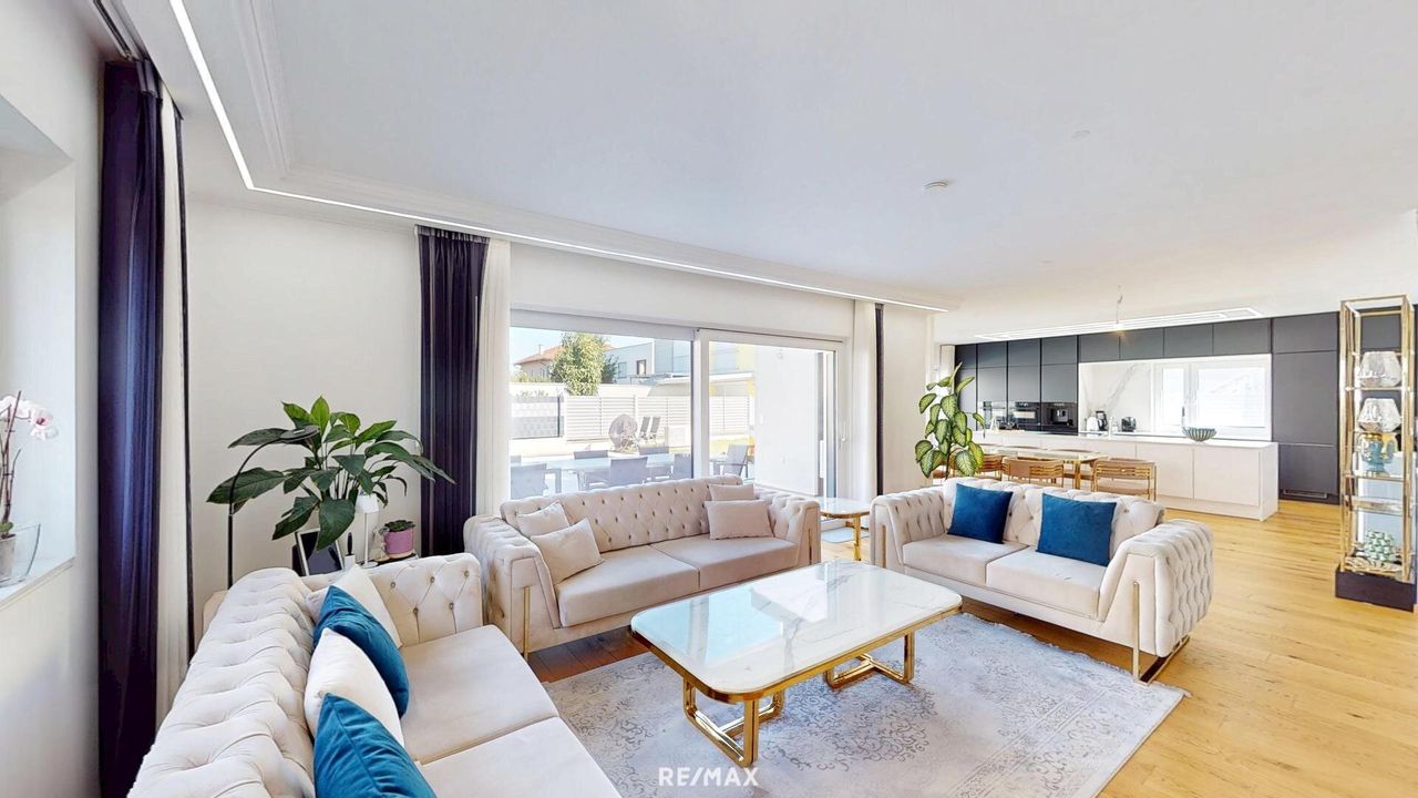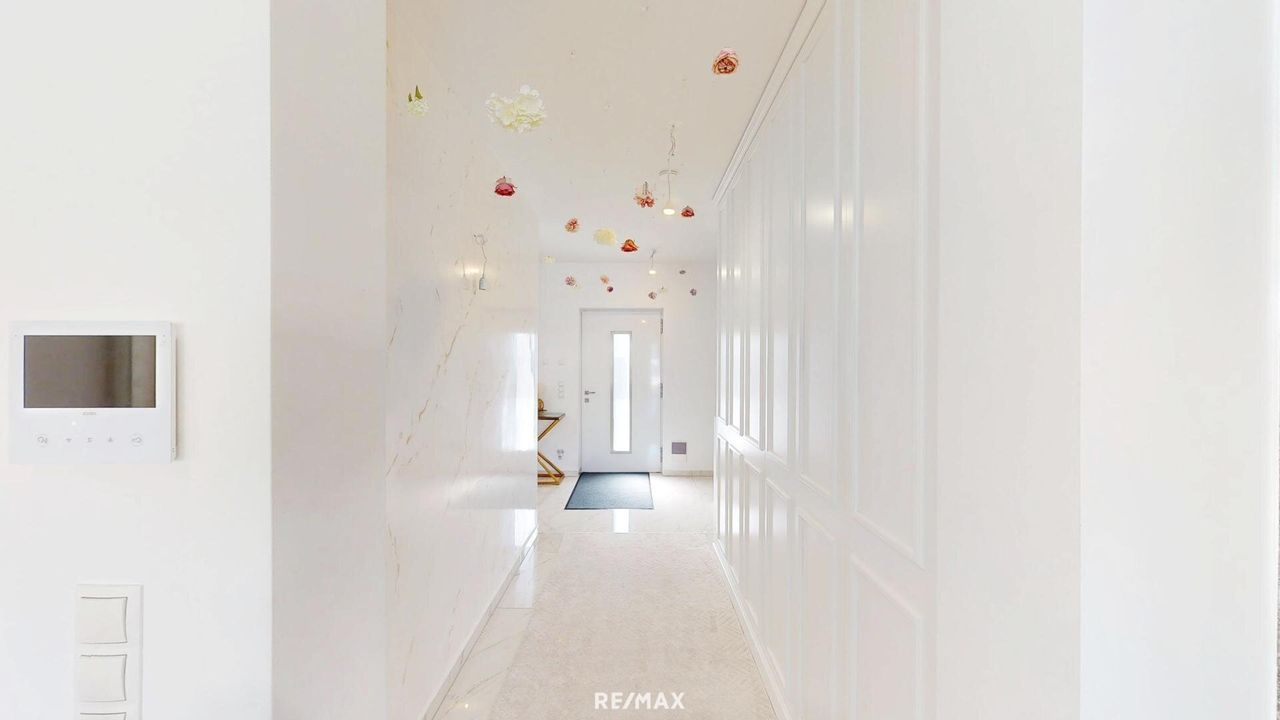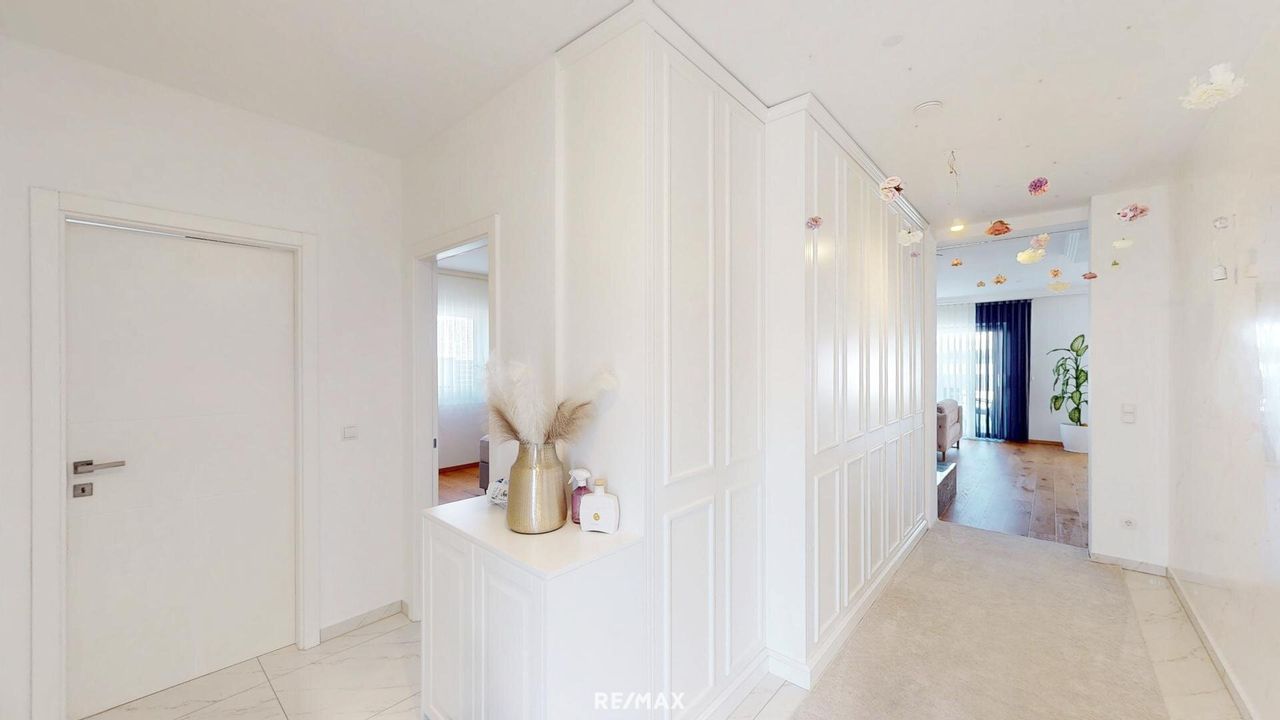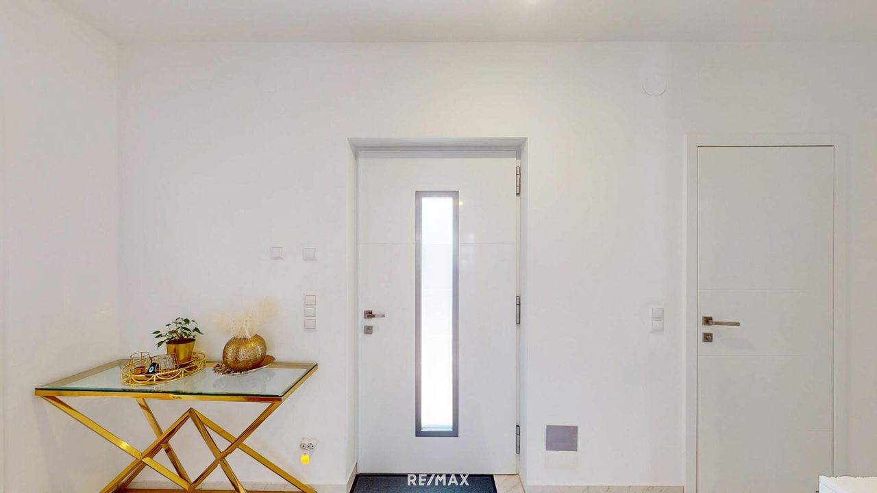 Die Villa wurde ca. 2021 in massiver Ziegelbauweise mit hochwertigem Vollwärmeschutz errichtet und bietet mit einer Raumhöhe von rund 2,75 m ein großzügiges, helles Wohngefühl. Dreifach isolierte Kunststofffenster mit elektrischen Rollläden (inkl. Fernbedienung) und integrierten Fliegengittern, elegante Eichenparkettböden geölt sowie edler Feinsteinzeug in allen Bädern unterstreichen die exklusive Ausstattung.
