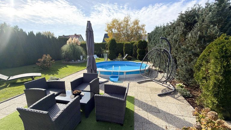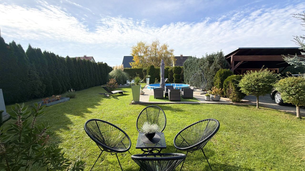 Außenbereich: Großzügiger Garten mit Swimmingpool, Pavillon mit Essbereich und Grillmöglichkeit, Carport für drei PKW, Gartenhütte sowie vier zusätzliche Autoabstellplätze für das Zinshaus.