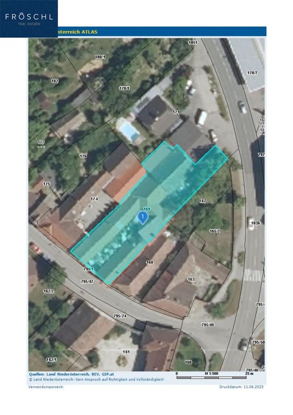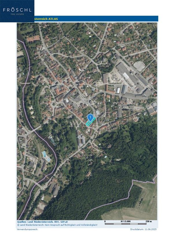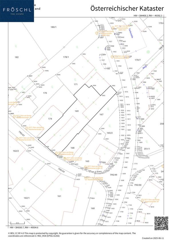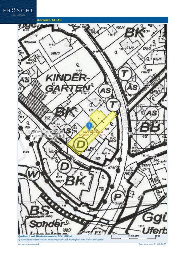 Das Grundstück liegt in Gars am Kamp und umfasst eine grundbücherliche Fläche von 1.017 m². Das Objekt steht unter Denkmalschutz und befindet sich laut Flächenwidmungsplan im Bauland Kerngebiet (BK) mit Denkmalschutz-Ausweisung (D). Das langgezogene Grundstück mit leichter Steigung von Südwest nach Nordost ist über die Rainharterstraße erschlossen.