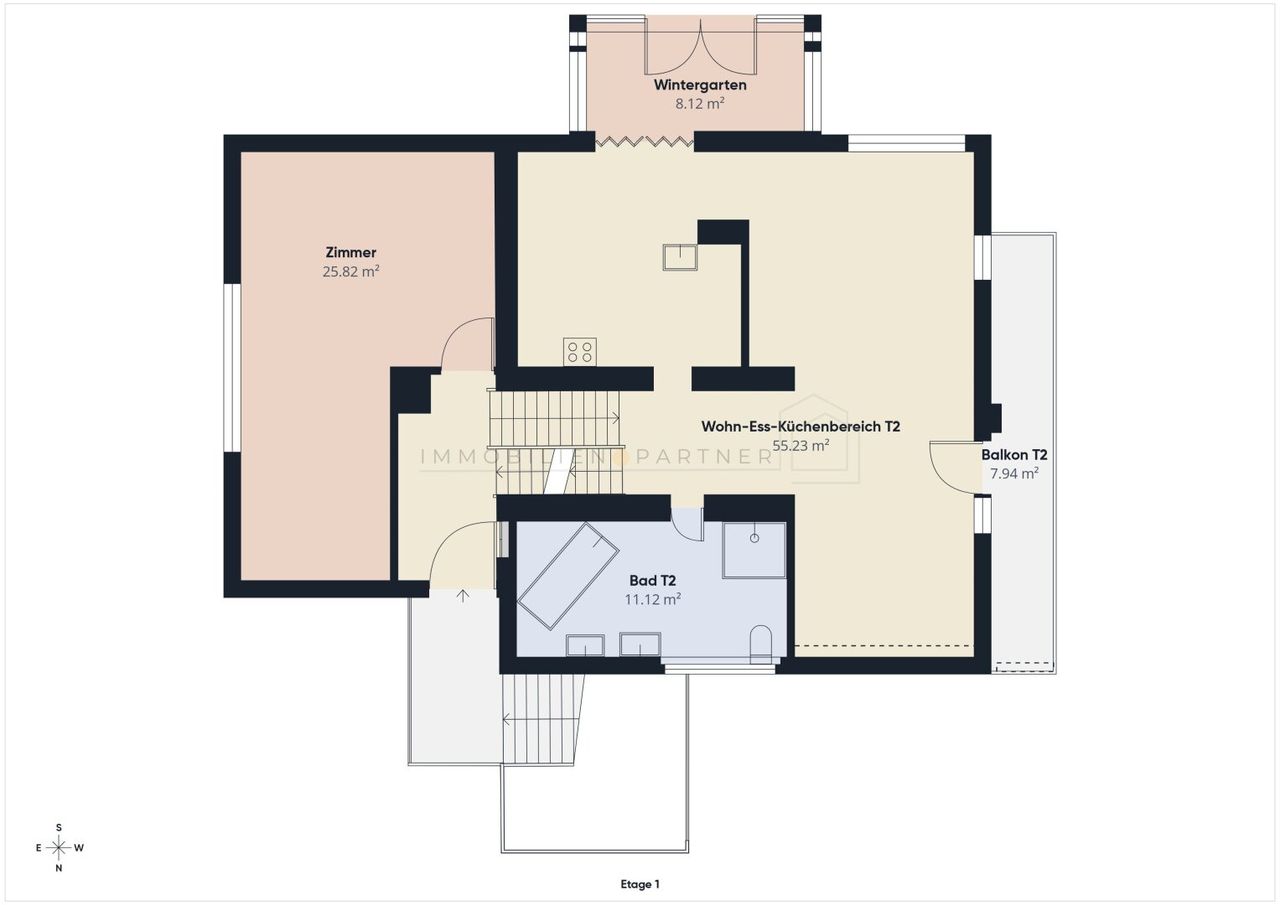 Die Liegenschaft umfasst zwei getrennte Wohneinheiten und erstreckt sich über mehrere Halbgeschosse, wodurch eine interessante und offene Raumstruktur entsteht. Die obere Maisonette-Wohnung (ca. 115 m²) überzeugt mit einem lichtdurchfluteten Wohnkonzept, Wintergarten, Galerie-Ebene sowie Balkon. Die darunterliegende Einheit (ca. 90 m²) bietet eine funktionale Raumaufteilung mit direktem Zugang zu Balkon, Terrasse und Garten.
