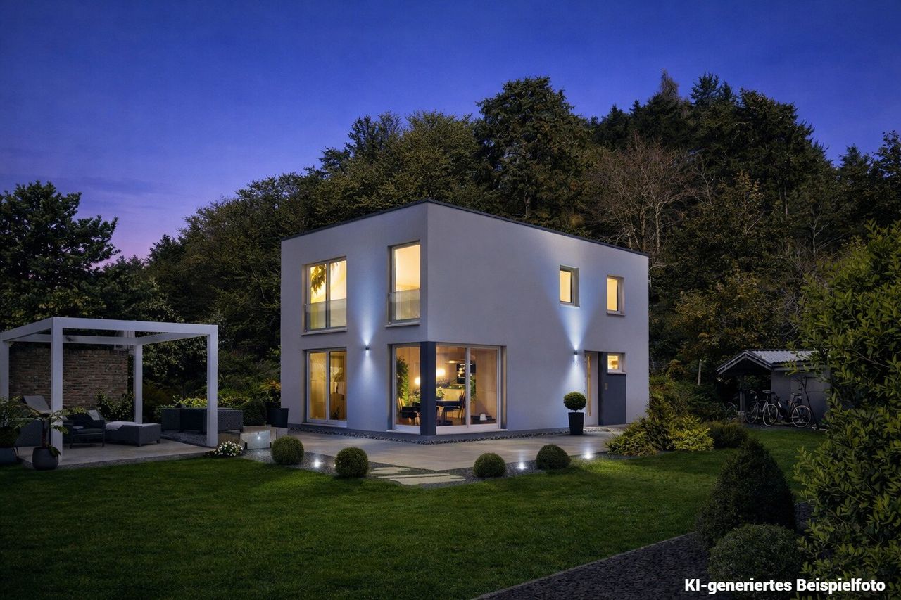 INFO: Bei den Fotos mit dem Haus handelt es sich um KI-generierte Beispielfotos und bei den Innenfotos handelt es sich nur um Einrichtungsbeispiele.