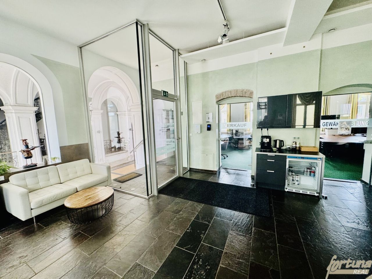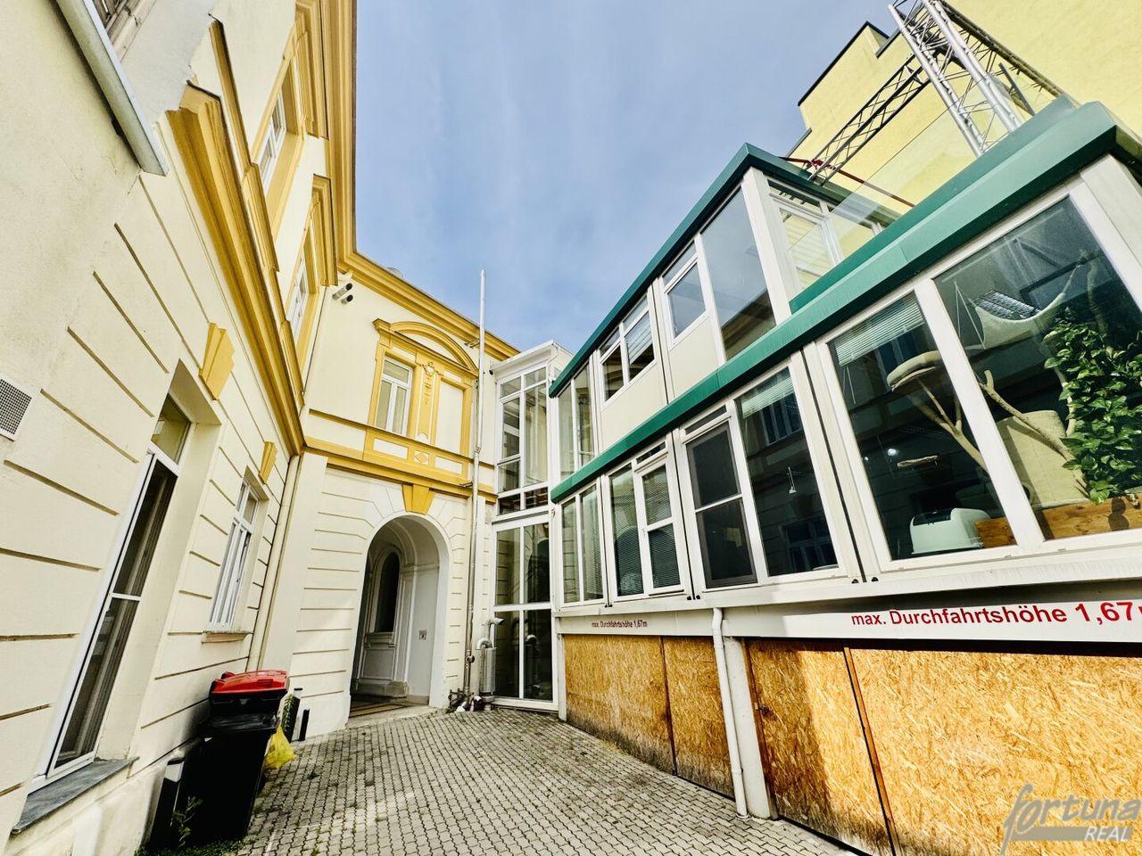 Das Eingangstor führt in die Durchfahrt. Links angeordnet ist der derzeitige Büro-Haupteingang. Rechts angeordnet ist ein Aufenthaltsraum mit Teeküche und Nassräumen und das halbovale Stiegenhaus, von welchem damals Wohnungen im OG erschlossen wurden. Die Büroflächen verteilen sich auf das Hochparterre, das Zwischengeschoß und das OG. Das OG verfügt ebenfalls über eine Teeküche und mehrere Nassräume.