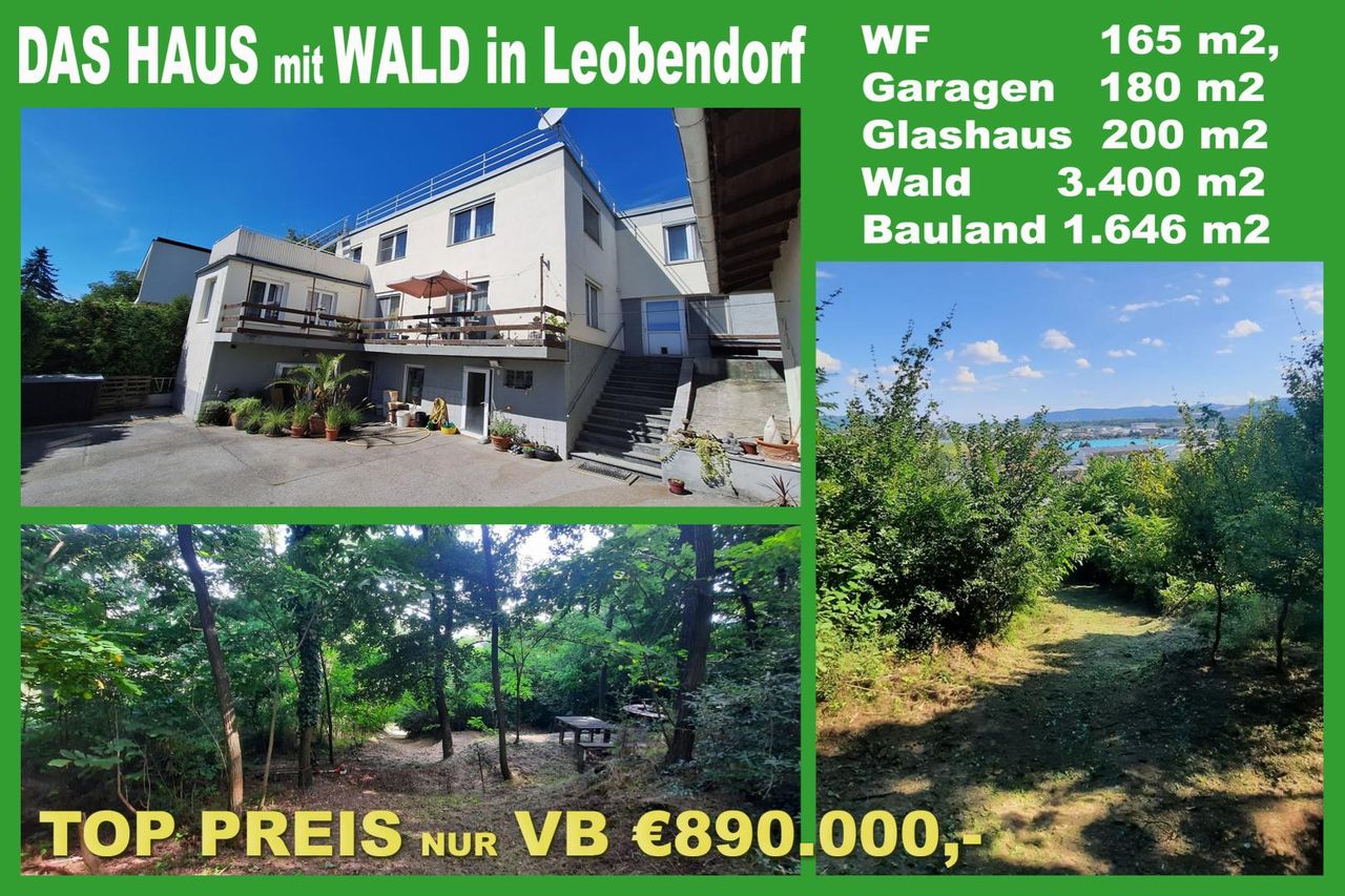 Großes Baugrundstück mit Althausbestand und Waldanteil in Leobendorf. Für Bauträger sind 2 Wohneinheiten möglich. Objektdaten: Kaufpreis: € 890.000,- Grundstück: 1.646 m2 Bauland 3.400 m2 Wald Althausbestand: Baujahr. ca.1969 Wohnfläche: ca. 165 m2 auf zwei Geschossen Kellergeschoss 65,25 m2 Bebaute Fläche: 110,10 m2 12m2 Balkon 12.61 m2 Terrasse Objektbeschreibung: Auf dem länglichen Baugrundstück befinden sich ein Haupthaus, ein Nebengebäude , sowie ein Glashaus mit ca. 200 m2 für eine Gärtnerei. Das 1969 errichtete Haupthaus in Massiv-Ziegel und Betonbauweise wurde später mit Kunststoff Isolierglasfenster ausgestattet. Das Haus ist renovierungsbedürftig, aber grundsätzlich erhaltenswürdig. Das Kellergeschoss mit einer Raumhöhe von 2,2 m bietet weitere...