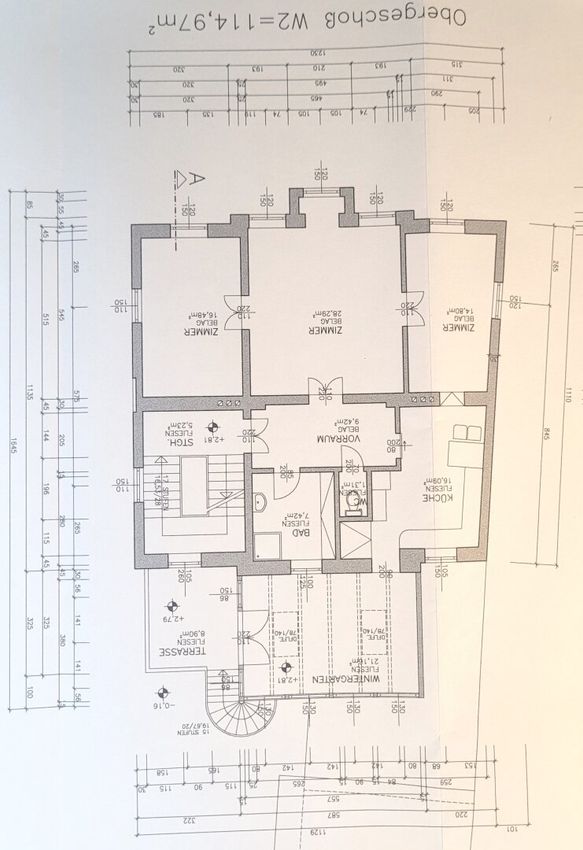 OG: Wohnung mit Küche, Bad, WC und 3 Zimmer sowie Stiegenhaus, Wintergarten und Terrasse
