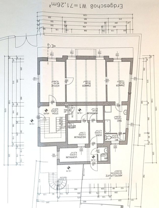 EG: Wohnung mit Küche, Bad, WC und 2 Zimmer sowie Stiegenhaus, Vorraum, Lagerraum und kleinem Waschraum