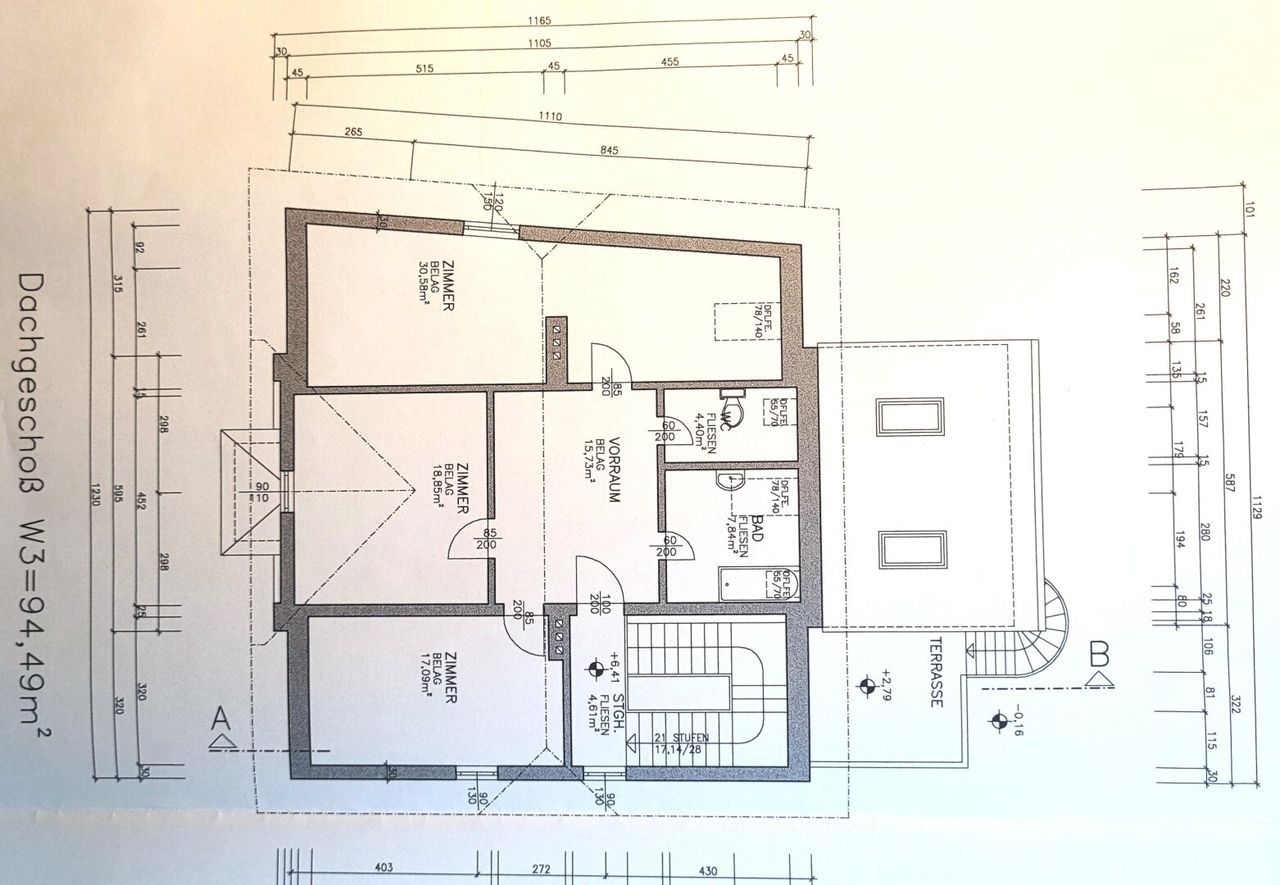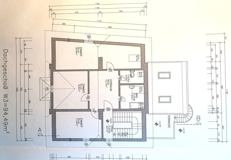 DG: Wohnung mit Bad, WC, großen Vorraum und 3 Zimmer sowie Stiegenhaus