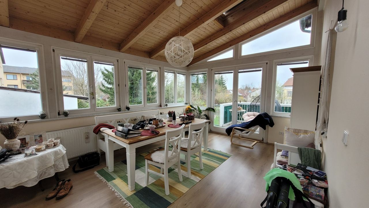 Das großzügige Wohnhaus erstreckt sich über 3 Ebenen und bietet insgesamt 9 Zimmer, die vielseitige Nutzungsmöglichkeiten eröffnen - ob als großzügiges Familienhaus, Arbeiten von Zuhause oder für Gästezimmer und Hobbys. Vor allem die tolle Raumhöhe im 1.Stock ( 3,20 m) schaffen eine exquisite und angenehme Wohnatmosphäre und bieten darüber hinaus viel Platz für individuelle Gestaltung. Toll ergänzt wird das 1.Obergeschoss durch einen Wintergarten (21m²) und einer Terrasse mit 8,9 m² mit einem Abgang in den Garten.