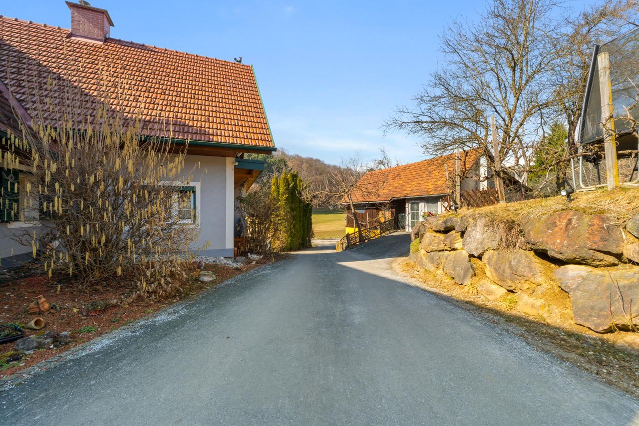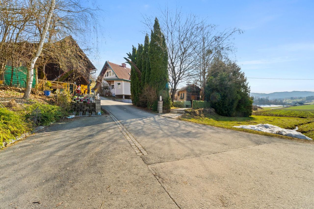 Die umliegenden Grundstücksflächen von insgesamt rund einem Hektar präsentieren sich überwiegend als Weideflächen und verleihen der gesamten Liegenschaft einen offenen, grünen Charakter. Die Lage inmitten der typischen Sausaler Hügellandschaft schafft ein besonders idyllisches Umfeld.