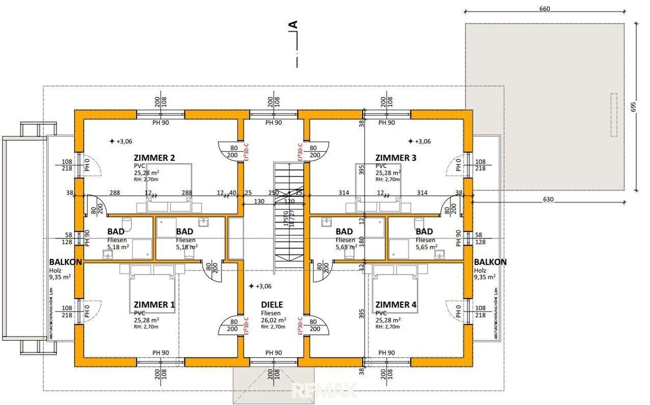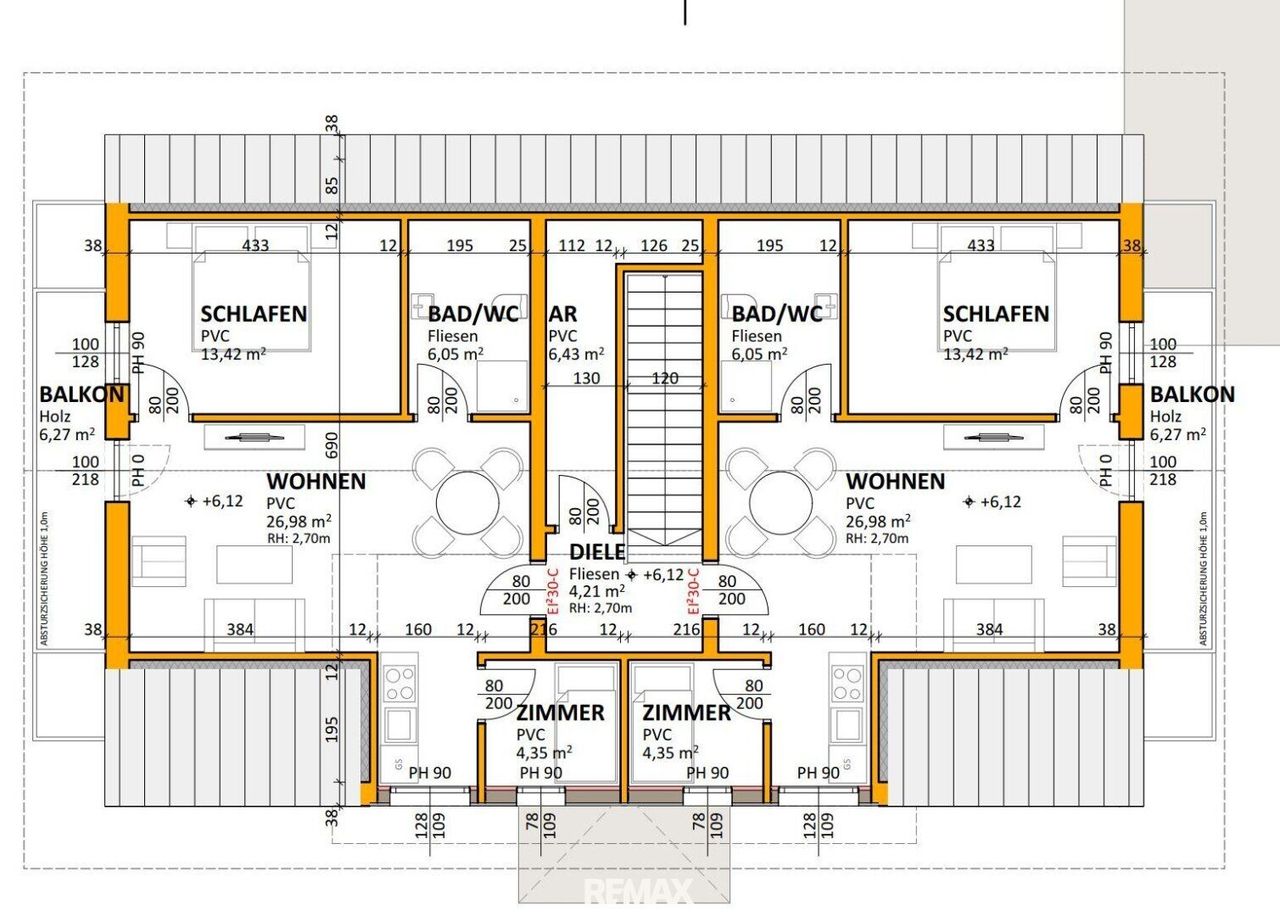 Dachgeschoß: 2 Apartments mit Bad/WC, Wohnbereich, 2 Schlafzimmer, 2 Balkone