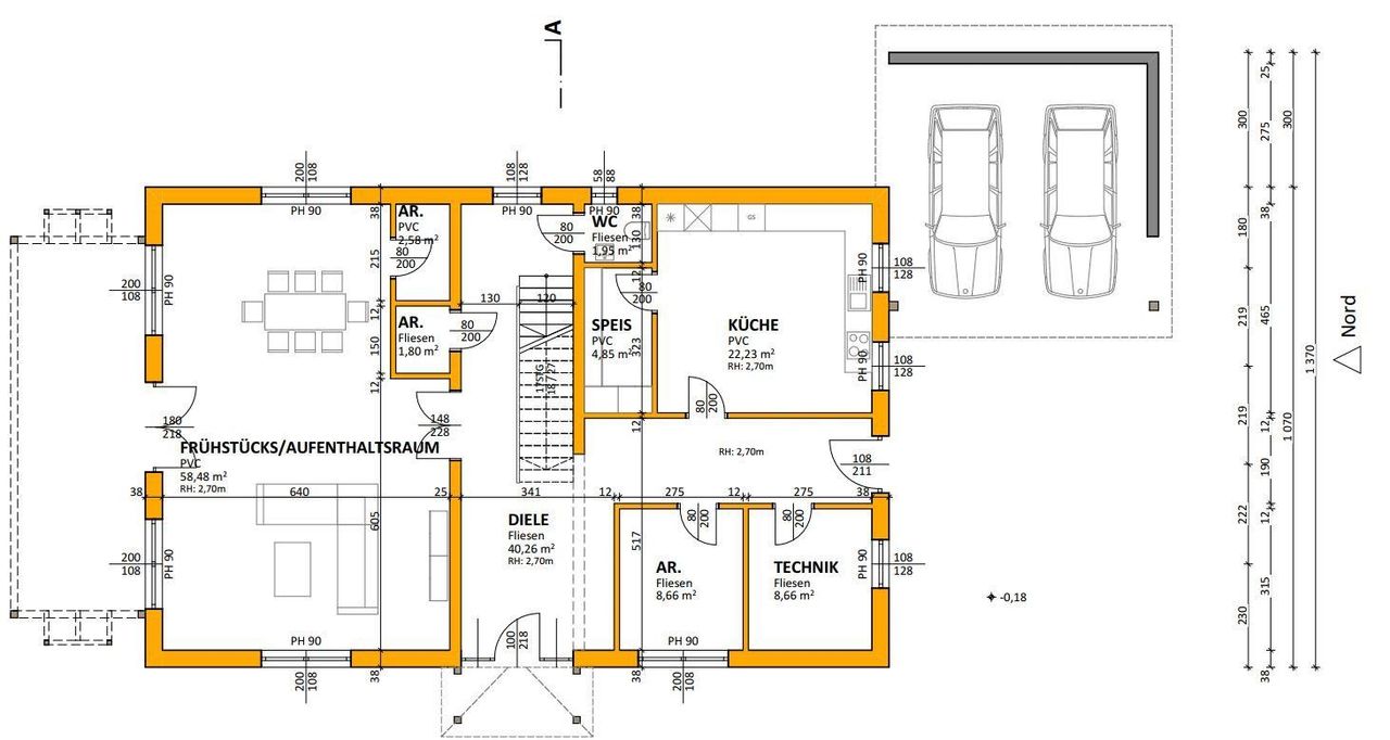 Erdgeschoß: Eingangsbereich, Gastroküche mit Speis, großer Wohnraum mit Ausgang in den Garten, mehrere Arbeits- und Technikräume (zB Ski-/Trockenraum, Waschküche/Bügelraum).