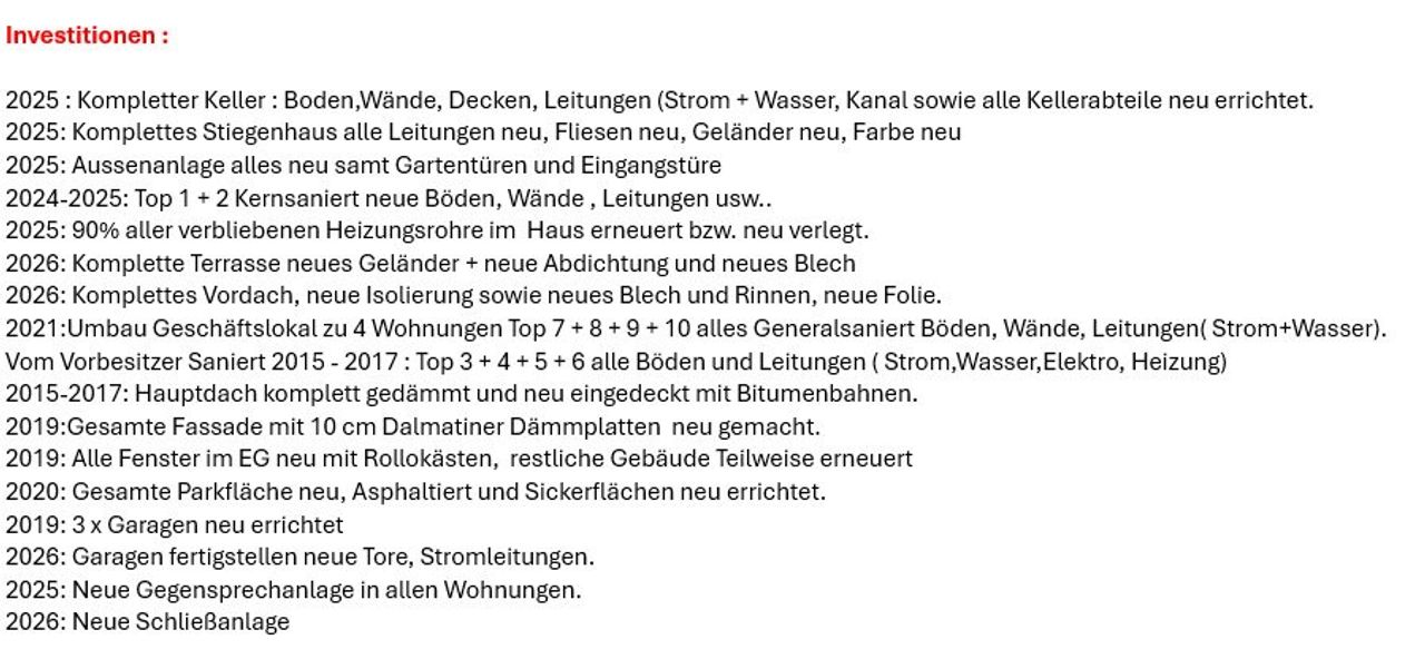 Daraus ergibt sich ein zusätzliches monatliches Nettopotenzial von ca. € 1.520. Bei Vollvermietung ist ein jährlicher Nettoertrag von ca. € 62.696,68 und eine Rendite von ca. 4,9 % erzielbar. Der aktuelle jährliche Nettoertrag beträgt € 43.456,–, was einer Rendite von 3,36 % entspricht. Auf Wunsch des Käufers kann sich der Verkäufer gerne noch um die Vermietung der Leerstände kümmern. Außenparkplätze wurden bislang noch nicht zugeteilt, die Garagen befinden sich aktuell in Fertigstellung. Den Bewohnern steht zudem eine allgemeine Terrasse im Obergeschoss zur Verfügung. Das Gebäude wurde in den vergangenen Jahren laufend und mit hohem Qualitätsanspruch saniert. Nahezu alle wesentlichen Bauteile und technischen Anlagen wurden erneuert, darunter das Dach, die gedämmte Fassade, Fenster, sämtliche Leitungen, Heizungsrohre, das Stiegenhaus, Kellerbereiche sowie die Außenanlagen. Mehrere Wohnungen wurden kern- bzw. generalsaniert und entsprechen einem zeitgemäßen Wohnstandard. Die vorhandenen Küchen und Badezimmermöbel stehen im Eigentum des Verkäufers und sind im Kaufpreis enthalten.