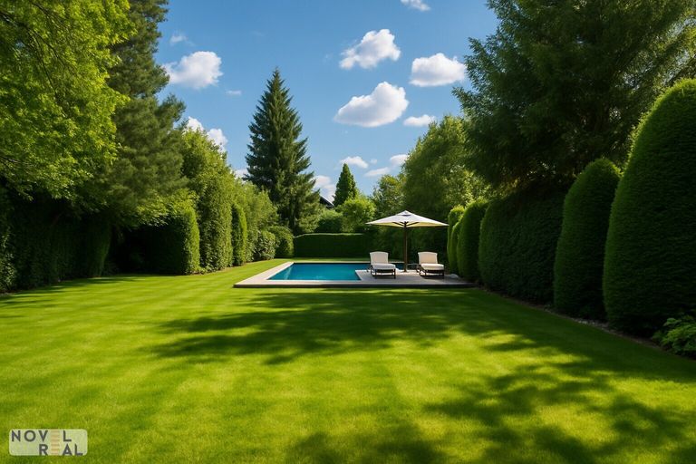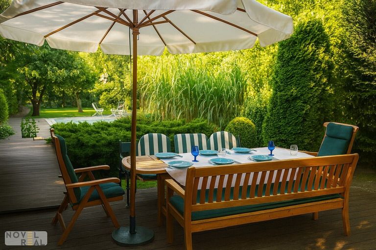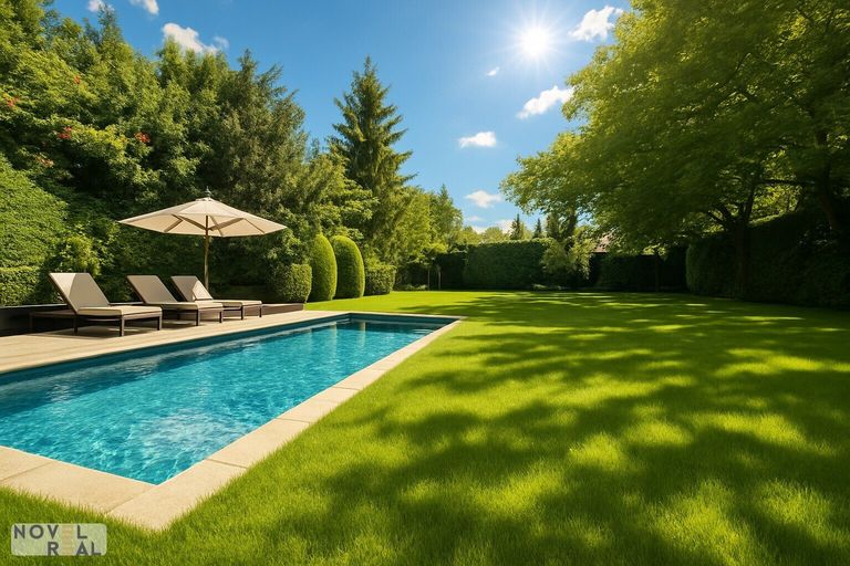 Hinter dem Hof erstreckt sich ein über 600 m² großer Garten, der nicht einsehbar und perfekt gepflegt ist. Ein Pool lädt an heißen Sommertagen zum Abkühlen ein, während Altbäume und Obstbäume Schatten und Früchte spenden. Eine Bewässerungsanlage sorgt dafür, dass der Garten immer in voller Blüte steht. Die hintere Grundstücksgrenze ist über eine ruhige Sackgasse erreichbar, wo ein Carport für zwei Autos, gesichert durch ein automatisches Einfahrtstor, bereitsteht. Auch von der Vorderseite kann das Grundstück über ein weiteres automatisches Tor betreten werden, was zusätzliche Parkmöglichkeiten in der Einfahrt, im Hof und in der Garage gestattet.