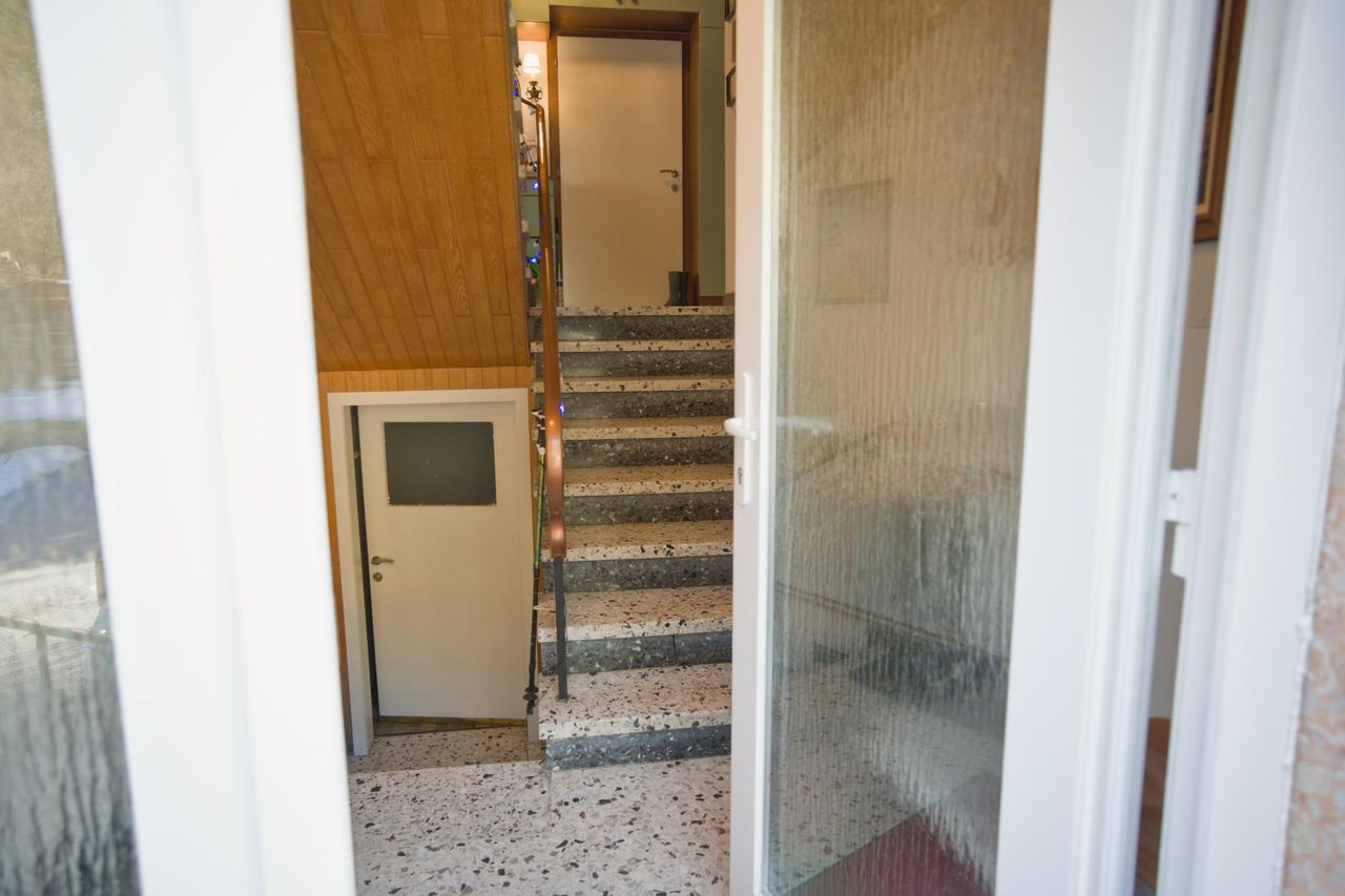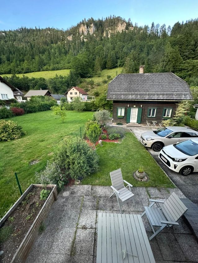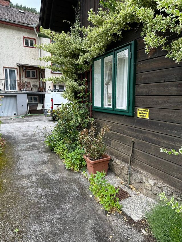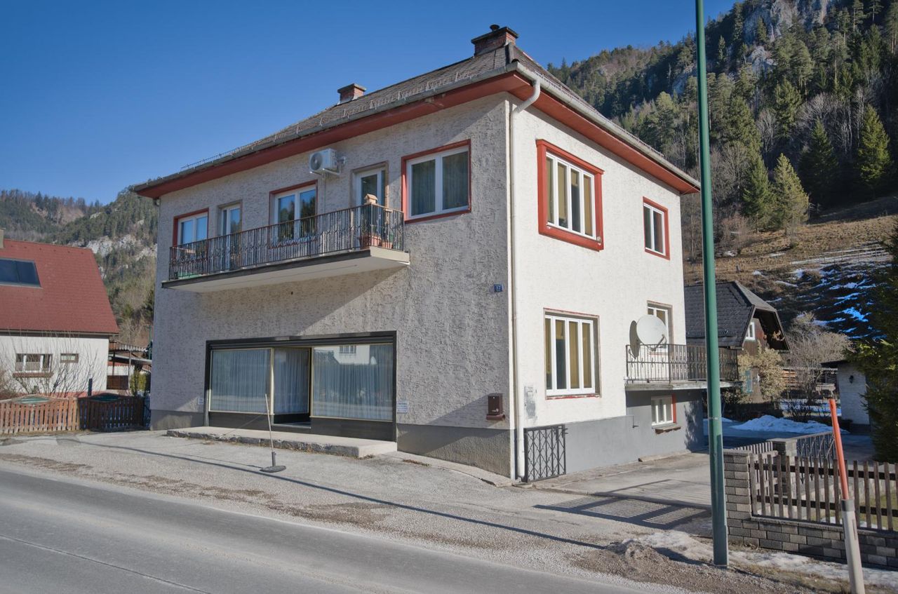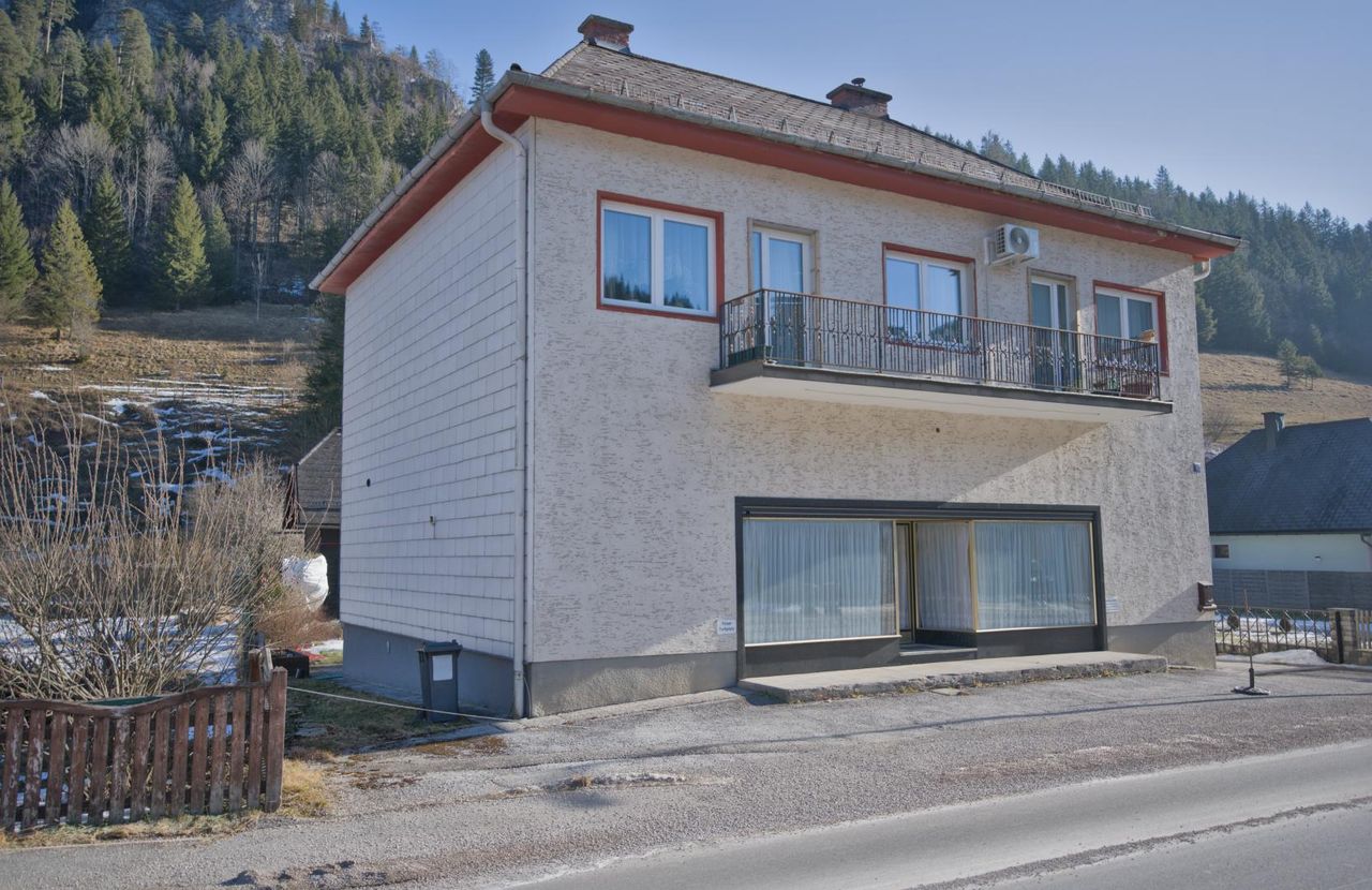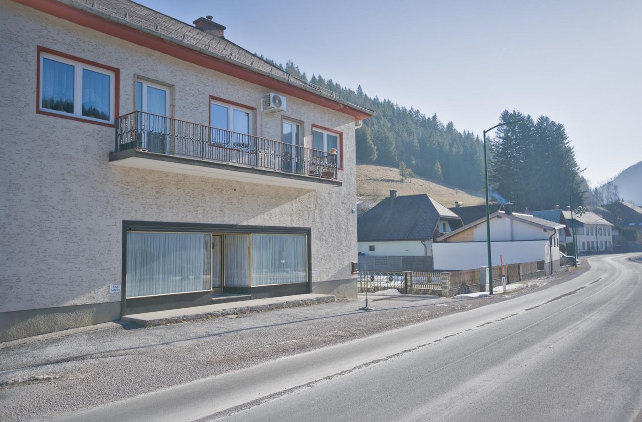 Das Erdgeschoss eignet sich ideal für Gewerbe oder Geschäftszwecke, direkt an der Straße Richtung Mariazell, mit Parkplätzen vor dem Haus und großer Glasfront.