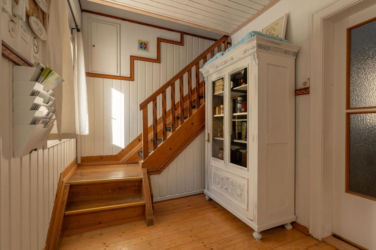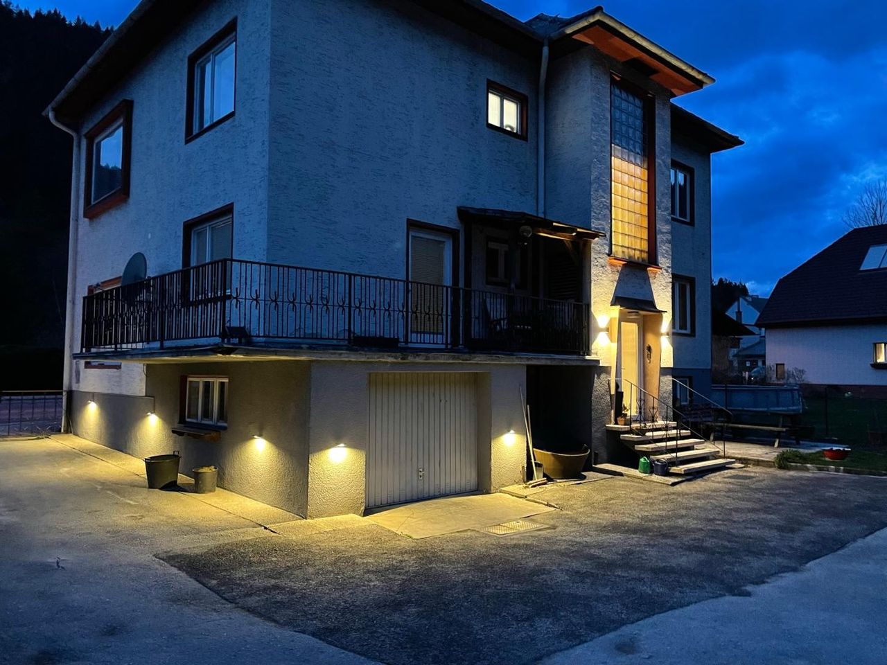 Das Haupthaus ist teilweise renoviert, zweigeschossig (je 130 m² pro Ebene), voll unterkellert, mit modernster Pelletheizung und separater Garage. Die Lage überzeugt durch wunderschöne Aussicht aus allen Fenstern.