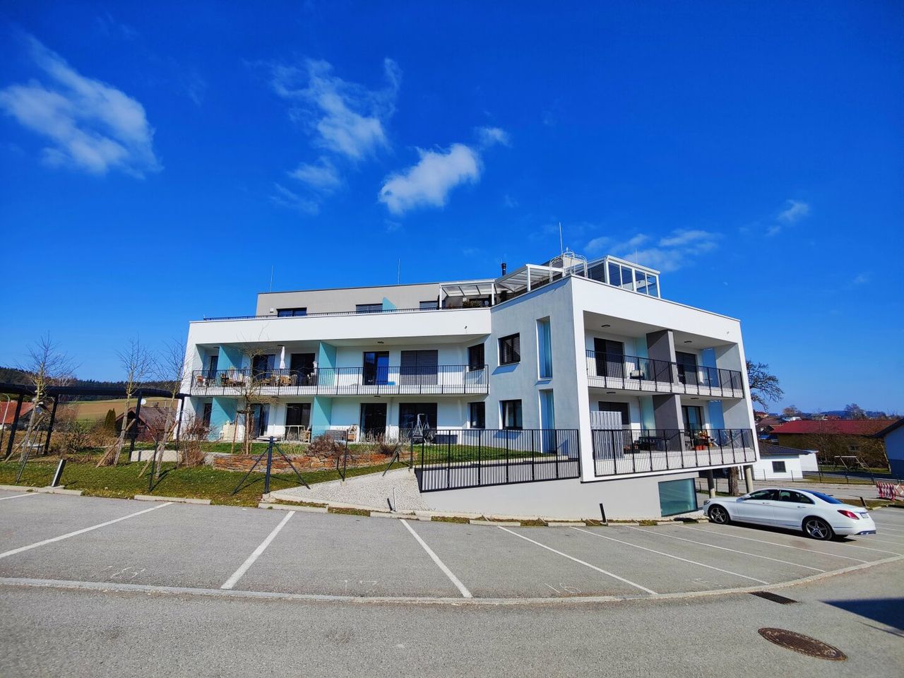 Jede Wohnung verfügt über großzügig Freiflächen in Form von Terrassen, Loggien oder Dachterrassen, ein Kellerabteil und einen Parkplatz. Der Garten, kann von allen Bewohnern genutzt werden.