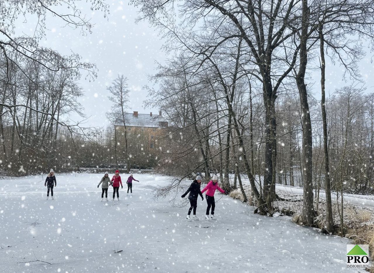 Es kann das Gesamte Areal erworben werden, mit Nebengebäude, Schlossteich auf insgesamt rund 14.458 m2 großem Grundstück.
