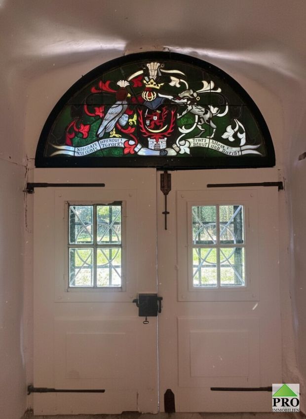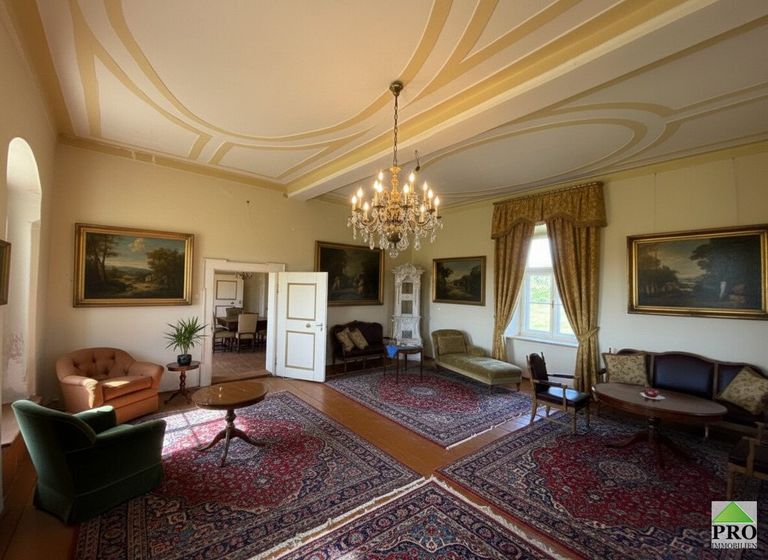 Das Gesamtgrundstück teilt sich auf: * 5.405m2 Schlossgrund, * Grundstück inkl. Nebengebäude 4.618m2 *4.435m2 Teichgrundstück; = Gesamt 14.458m2