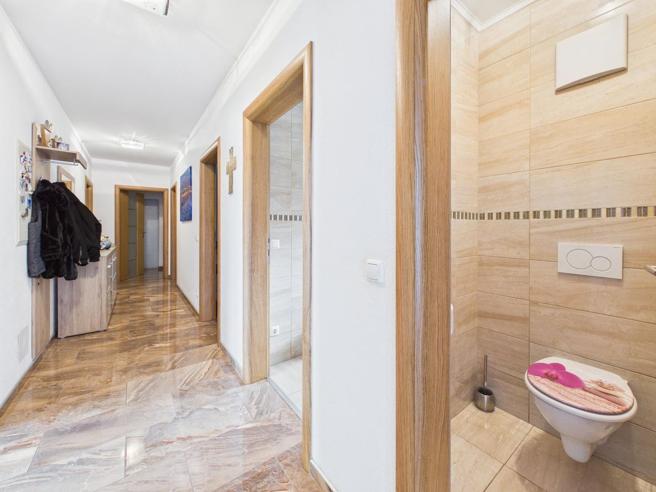 Das Haus wurde 2014 in hochwertiger Massivbauweise errichtet und befindet sich in einem sehr gepflegten Zustand. Aktuell umfasst die Liegenschaft rund 192 m² Wohnfläche, aufgeteilt auf Erd- und Obergeschoss – jeweils mit identischer, durchdachter Raumaufteilung.