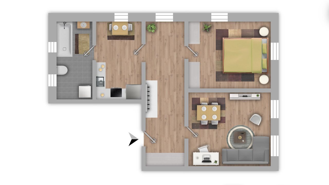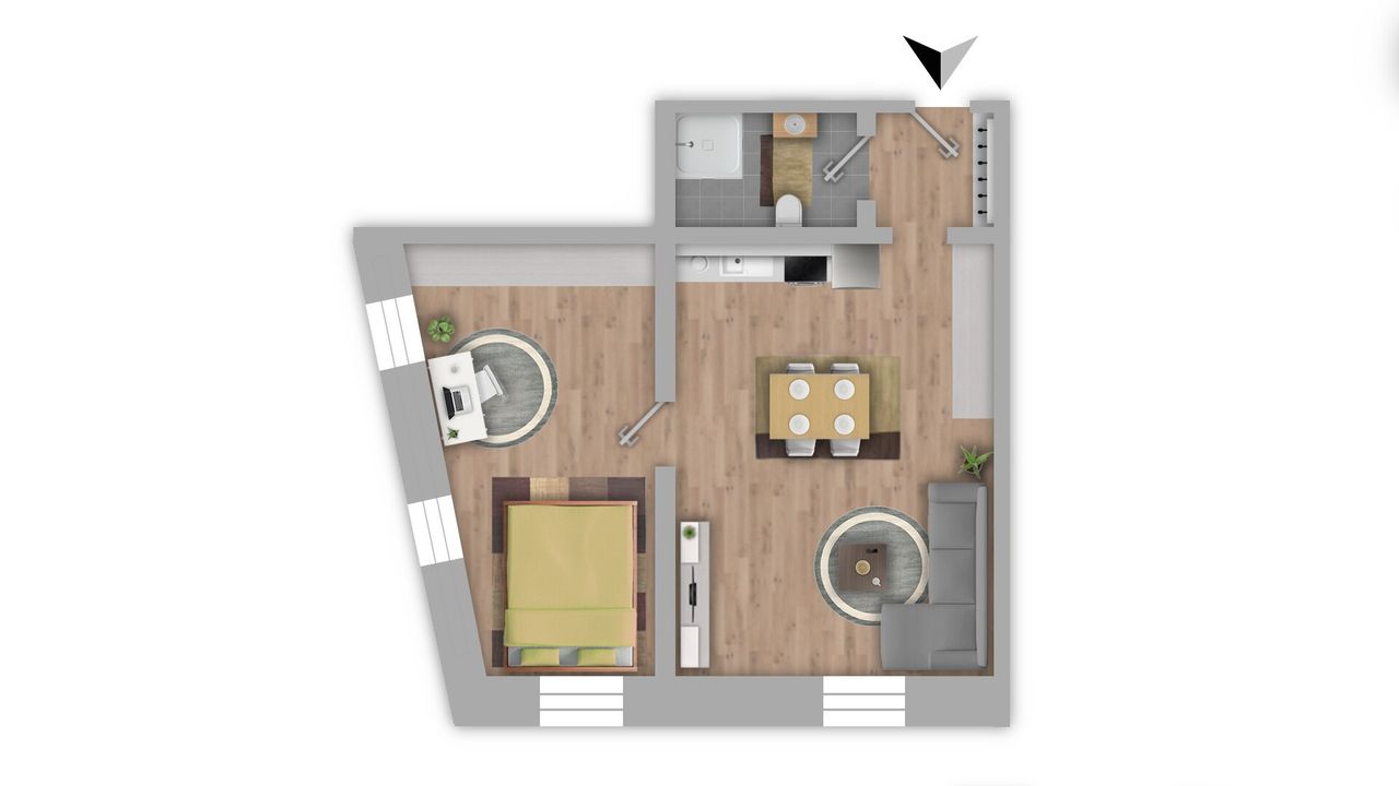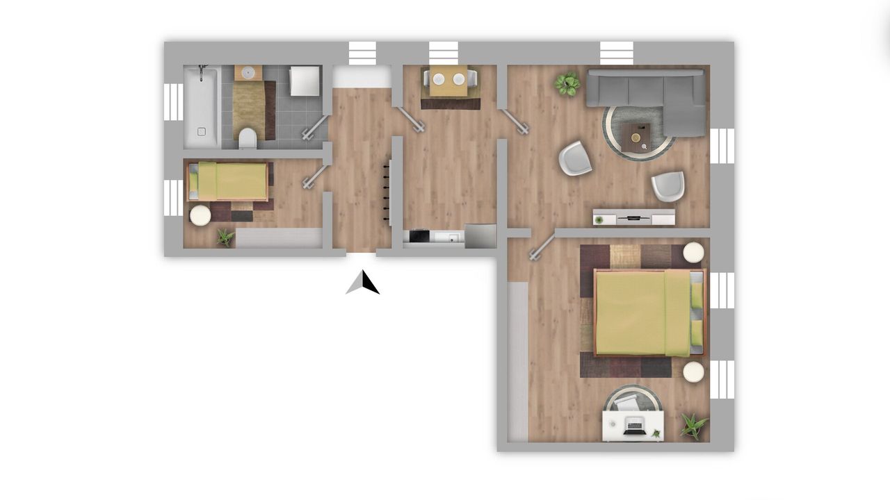 1.OG: Top 2 mit ca. 89 m² (Vorraum, Wohnzimmer, Schlafzimmer, Küche, Bad mit WC), Top 6 mit ca. 105 m² (Wohnzimmer, Küche, Schlafzimmer, Vorraum, Wirtschaftsraum, Bad mit WC)