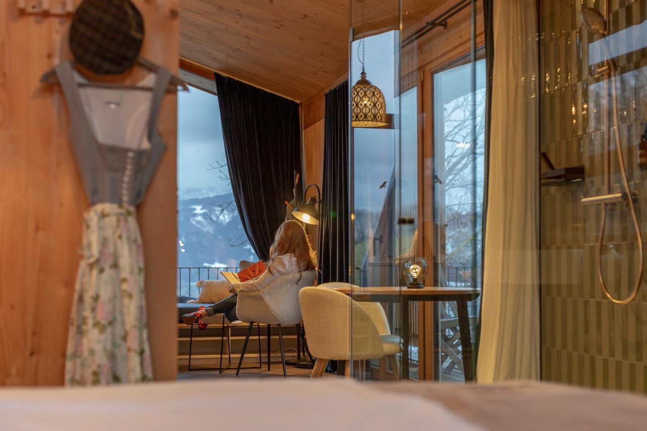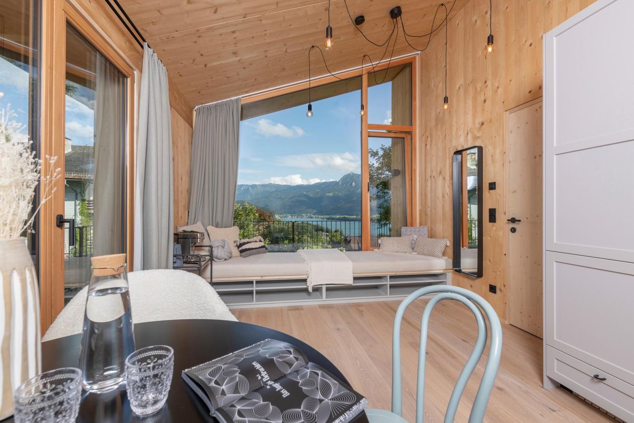 Der Blick über weitreichendes Grünland auf den Wolfgangsee ist allgegenwärtig und prägt das gesamte Wohn- und Aufenthaltsgefühl. Ob von den Apartments, den Terrassen, den Duschen oder den freistehenden Badewannen auf der begrünten Dachterrasse aus – der See wird hier nicht nur gesehen, sondern wurde bewusst ins Wohnkonzept integriert.