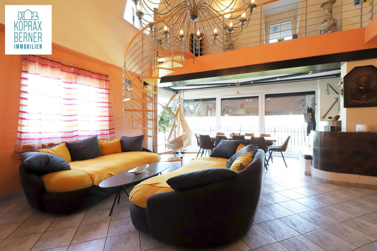 > großes Wohnzimmer mit Essbereich und Wendeltreppe zur Galerie