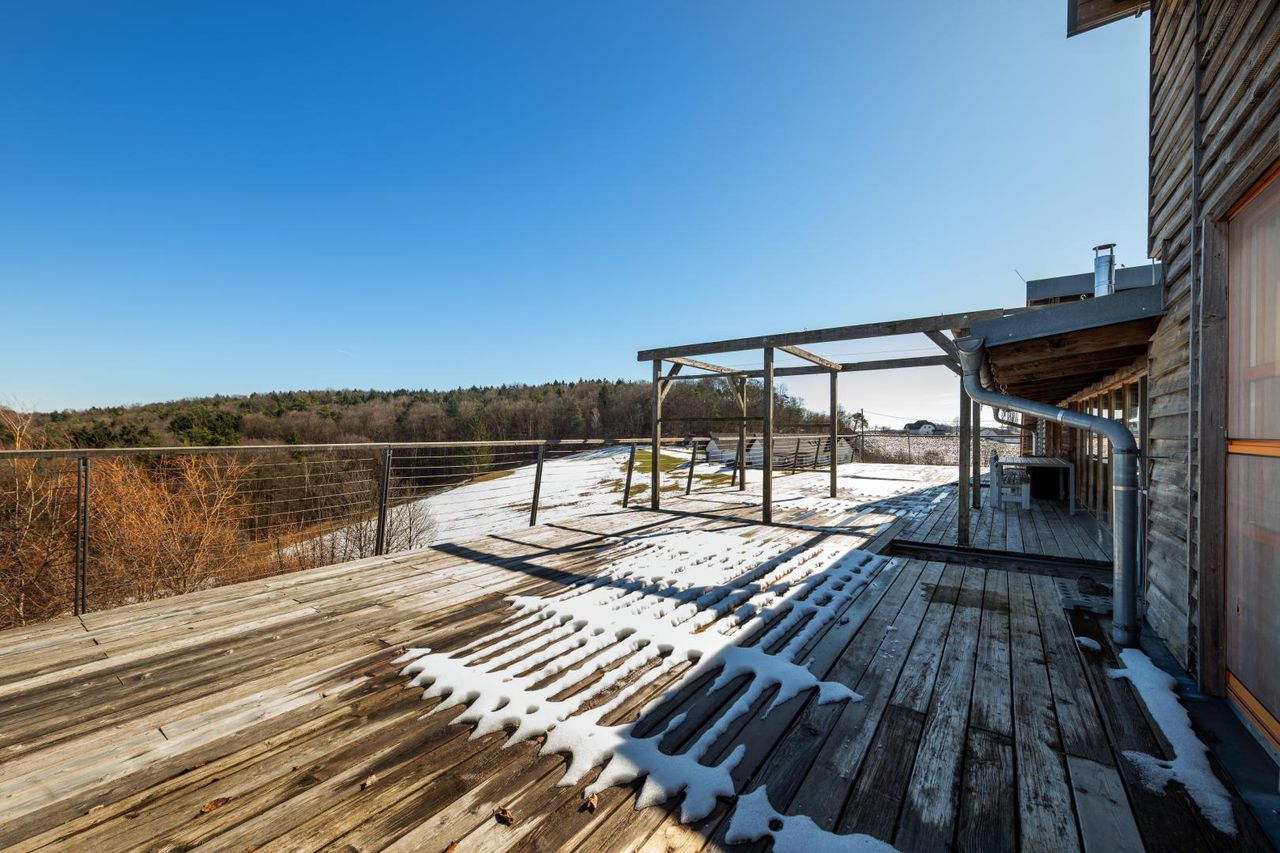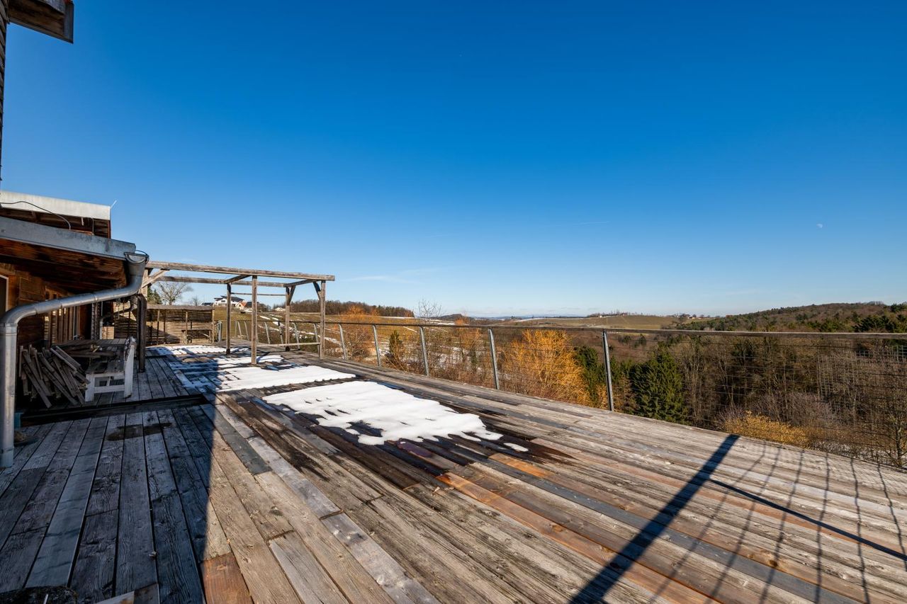 Von hier aus betreten Sie die großzügige, rund 129 m² große Terrasse mit traumhaftem Ausblick über die umliegende Landschaft – ein Ort für lange Sommerabende, Feste mit Freunden oder stille Momente mit Blick ins Grüne.