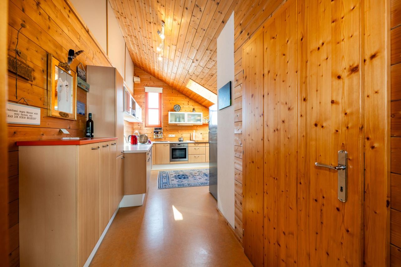 Von der Küche aus gelangen Sie direkt auf eine rund 35 m² große Terrasse – ein geschützter Platz für den ersten Kaffee am Morgen oder entspannte Stunden im Freien.
