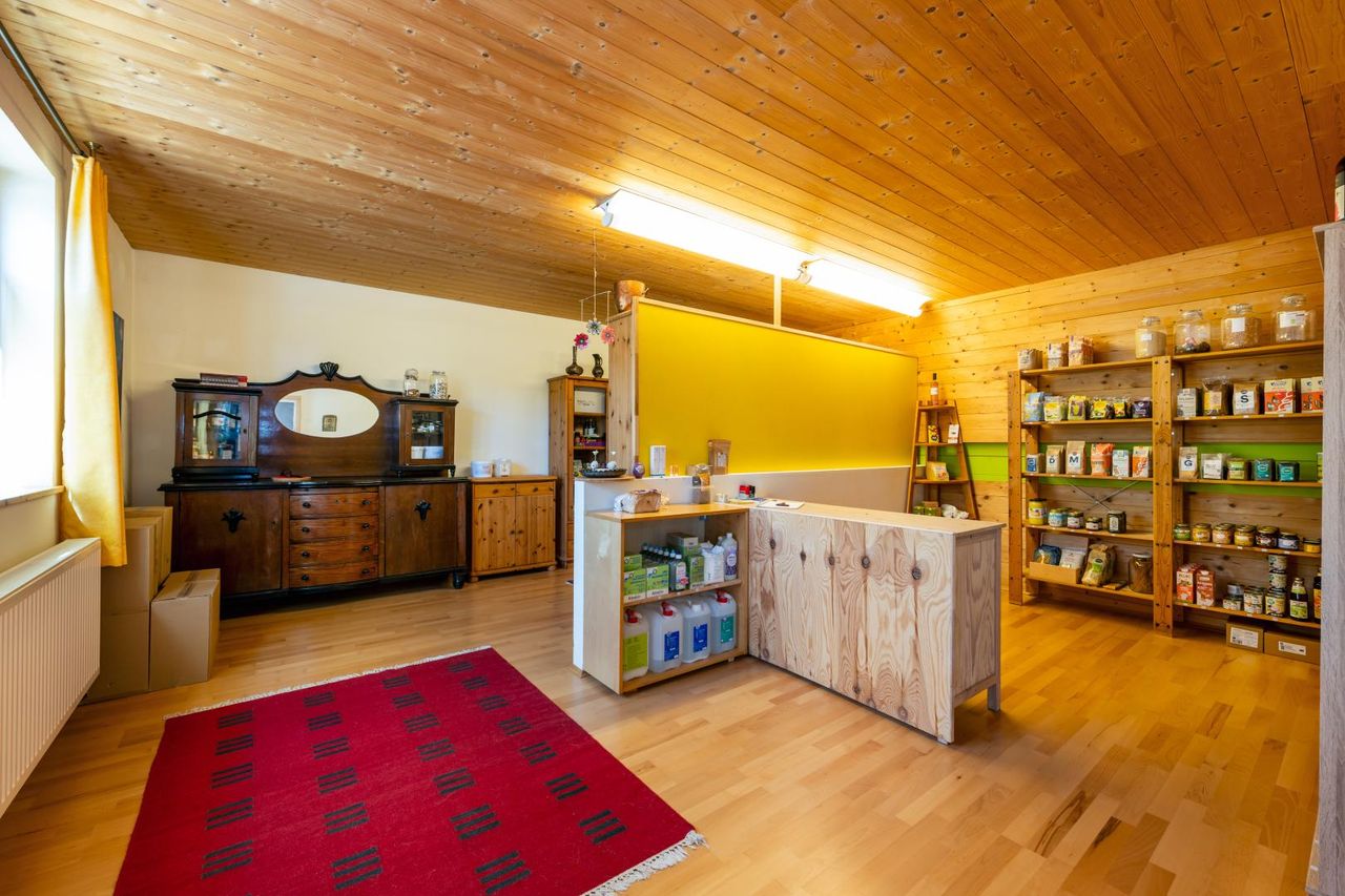 Bereits das Erdgeschoss empfängt mit einem großzügigen Eingangsbereich und einem kleinen Laden und bietet ein harmonisches Zusammenspiel aus Wohnraum, Küche und Büro.