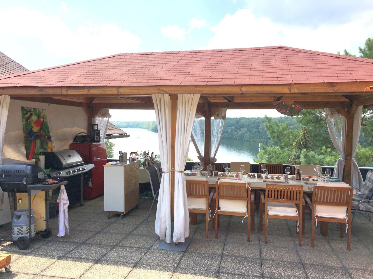 Der Boden aus Naturstein, ein großer Esstisch unter freiem Himmel, darüber eine solide Überdachung, die Schatten spendet – oder Schutz, wenn das Sommergewitter vorbeizieht. Drum herum blühende Pflanzen, das Rascheln der Bäume, das Rufen eines Vogels aus dem angrenzenden Wald.
