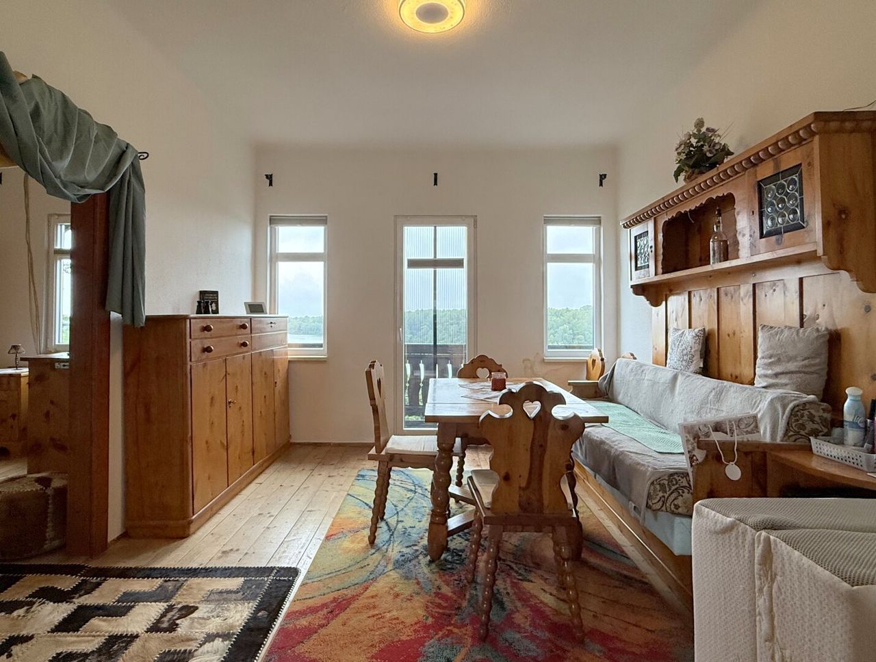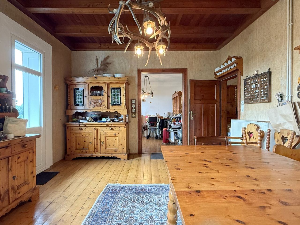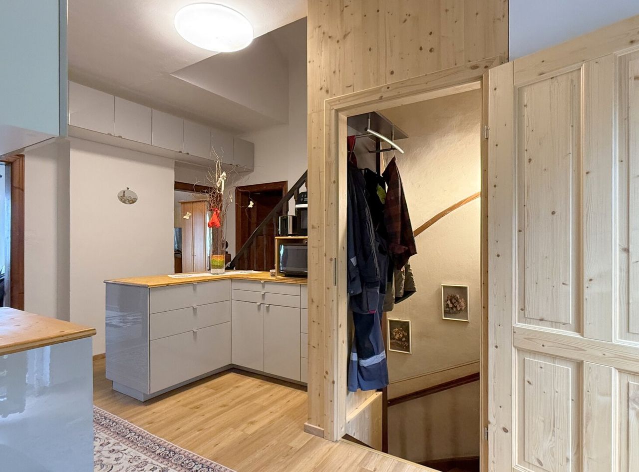Die ursprüngliche Bauphase reicht zurück bis 1930, mit einem charmanten Altbestand, der heute noch rund 176 m² Wohnfläche auf zwei Ebenen bietet. Die Räume sind liebevoll altmodisch, verwinkelt, heimelig. Holz dominiert. Man spürt das Alter des Hauses – aber im besten Sinn. Es hat Charakter, Haltung, Tiefe. Und wer auf diesen Dielen geht, hört die Geschichten früherer Zeiten.